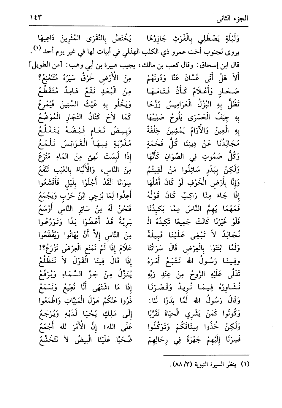 يرْوى لجنوب أُخْت عَمْرو ذِي الْكَلْب الْهُذلِيّ فِي أَبْيَات لَهَا فِي غير يَوْم أحد قَالَ ابْن إِسْحَاق وَقَالَ كَعْب بن مَالك يُجيب هُبَيْرَة بن أبي وهب // (من الطَّوِيل) //