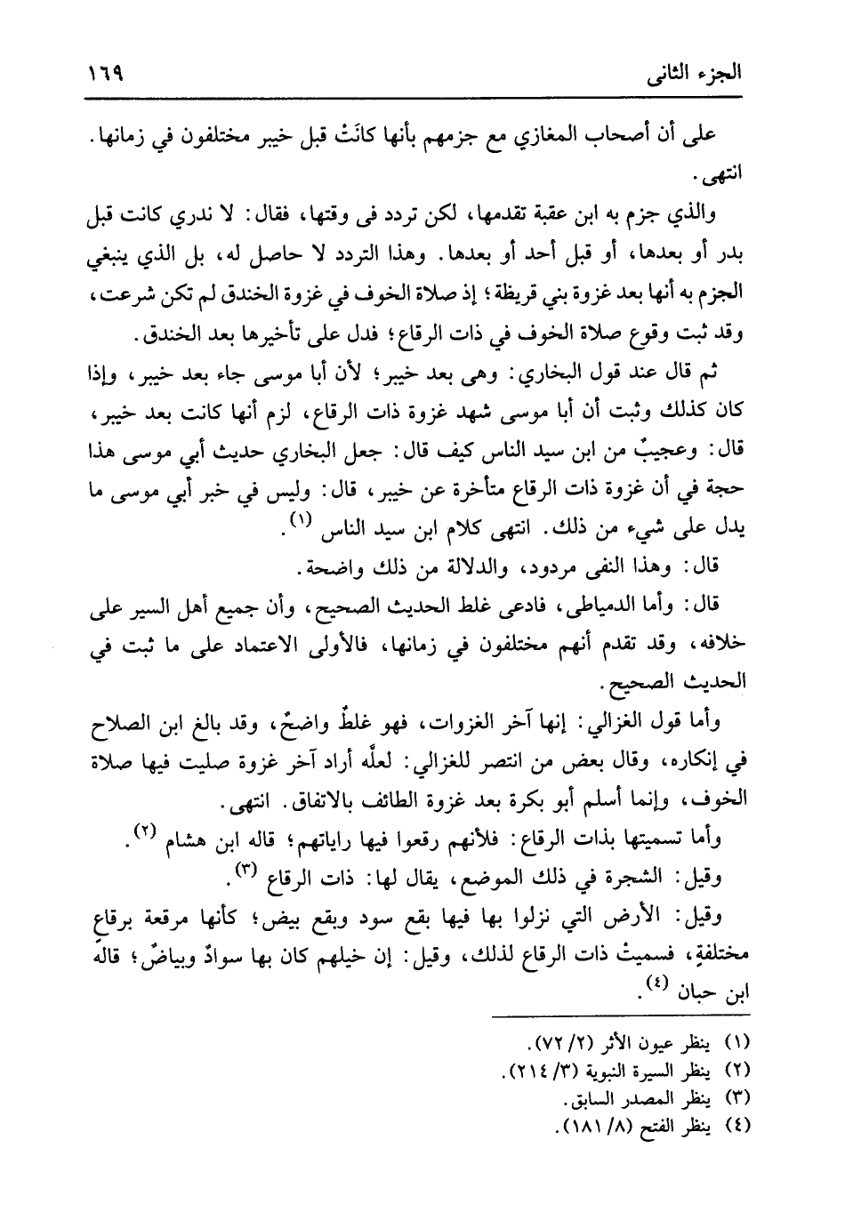 على أَن أَصْحَاب الْمَغَازِي مَعَ جزمهم بِأَنَّهَا كانَتْ قبل خَيْبَر مُخْتَلفُونَ فِي زمانها انْتهى وَالَّذِي جزم بِهِ ابْن عقبَة تقدمها لَكِن تردد فِي وَقتهَا فَقَالَ لَا نَدْرِي كَانَت قبل بدر أَو بعْدهَا أَو قبل أحد أَو بعْدهَا وَهَذَا التَّرَدُّد لَا حَاصِل لَهُ بل الَّذِي يَنْبَغِي الْجَزْم بِهِ أَنَّهَا بعد غَزْوَة بني قُرَيْظَة إِذْ صَلَاة الْخَوْف فِي غَزْوَة الخَنْدَق لم تكن شرعت وَقد ثَبت وُقُوع صَلَاة الْخَوْف فِي ذَات الرّقاع فَدلَّ على تَأْخِيرهَا بعد الخَنْدَق ثمَّ قَالَ عِنْد قَول البُخَارِيّ وَهِي بعد خَيْبَر لِأَن أَبَا مُوسَى جَاءَ بعد خَيْبَر وَإِذا كَانَ كَذَلِك وَثَبت أَن أَبَا مُوسَى شهد غَزْوَة ذَات الرّقاع لزم أَنَّهَا كَانَت بعد خَيْبَر قَالَ وَعَجِيب من ابْن سيد النَّاس كَيفَ قَالَ جعل البُخَارِيّ حَدِيث أبي مُوسَى هَذَا حجَّة فِي أَن غَزْوَة ذَات الرّقاع مُتَأَخِّرَة عَن خَيْبَر قَالَ وَلَيْسَ فِي خَيْبَر أبي مُوسَى مَا يدل على شَيْء من ذَلِك انْتهى كَلَام ابْن سيد النَّاس قَالَ وَهَذَا النَّفْي مَرْدُود وَالدّلَالَة من ذَلِك وَاضِحَة قَالَ وَأما الدمياطى فَادّعى غلط الحَدِيث الصَّحِيح وَأَن جَمِيع أهل السّير على خِلَافه وَقد تقدم أَنهم مُخْتَلفُونَ فِي زمانها فَالْأولى الِاعْتِمَاد على مَا ثَبت فِي الحَدِيث الصَّحِيح وَأما قَول الْغَزالِيّ إِنَّهَا آخر الْغَزَوَات فَهُوَ غلطٌ وَاضح وَقد بَالغ ابْن الصّلاح فِي إِنْكَاره وَقَالَ بعض من انتصر للغزالي لعلَه أَرَادَ آخر غَزْوَة صليت فِيهَا صَلَاة الْخَوْف وَإِنَّمَا أسلم أَبُو بكرَة بعد غَزْوَة الطَّائِف بالِاتِّفَاقِ انْتهى وَأما تَسْمِيَتهَا بِذَات الرّقاع فلأنهم رقعوا فِيهَا راياتهم قَالَه ابْن هِشَام وَقيل الشَّجَرَة فِي ذَلِك الْموضع يُقَال لَهَا ذَات الرّقاع وَقيل الأَرْض الَّتِي نزلُوا بهَا فِيهَا بقع سود وبقع بيض كَأَنَّهَا مرقعة برقاعٍ مختلفةٍ فسميتْ ذَات الرّقاع لذَلِك وَقيل إِن خيلهم كَانَ بهَا سوادٌ وَبَيَاض قَالَه ابْن حبَان