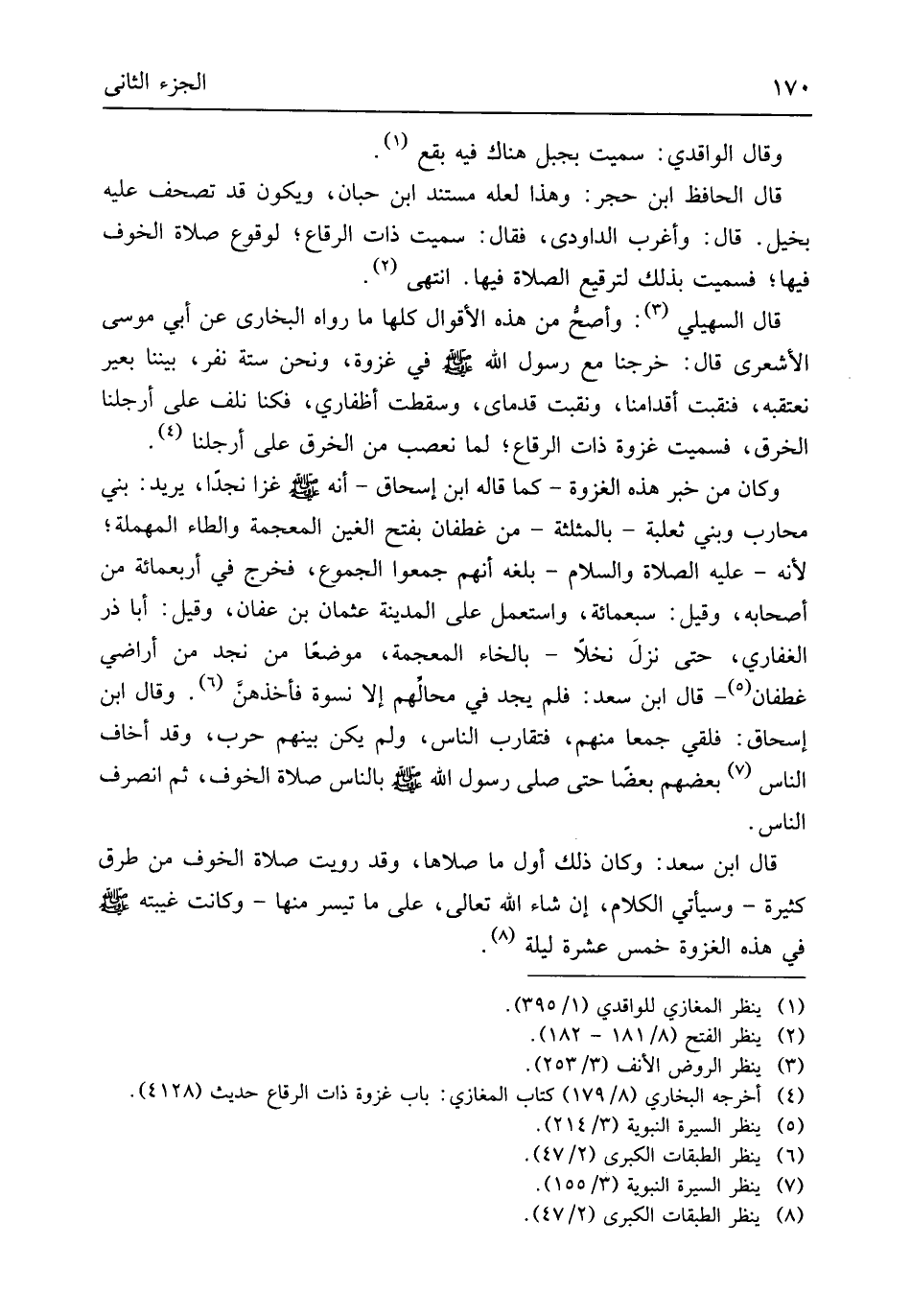 بِالنَّاسِ صَلَاة الْخَوْف ثمَّ انْصَرف النَّاس قَالَ ابْن سعد وَكَانَ ذَلِك أول مَا صلاهَا وَقد رويت صَلَاة الْخَوْف من طرق كَثِيرَة وَسَيَأْتِي الْكَلَام إِن شَاءَ الله تَعَالَى على مَا تيَسّر مِنْهَا وَكَانَت غيبته