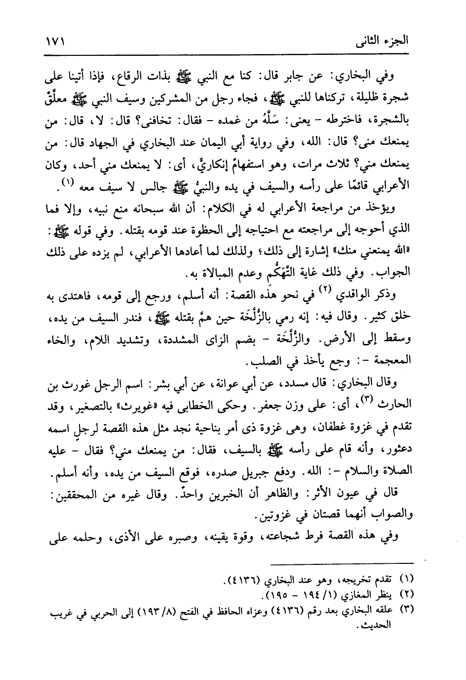 بِالسَّيْفِ فَقَالَ من يمنعك مني فَقَالَ عَلَيْهِ الصَّلَاة وَالسَّلَام الله وَدفع جِبْرِيل صَدره فَوَقع السَّيْف من يَده وَأَنه أسلم قَالَ فِي عُيُون الْأَثر وَالظَّاهِر أَن الْخَبَرَيْنِ واحدٌ وَقَالَ غَيره من الْمُحَقِّقين وَالصَّوَاب أَنَّهُمَا قصتان فِي غزوتين وَفِي هَذِه الْقِصَّة فرط شجاعته وَقُوَّة يقينه وَصَبره على الْأَذَى وحلمه على