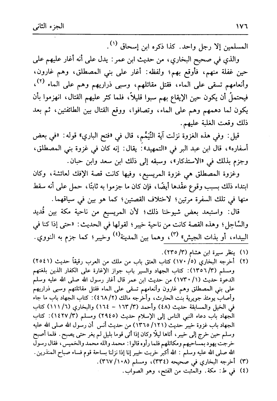 الْمُسلمين إِلَّا رجل وَاحِد كَذَا ذكره ابْن إِسْحَاق وَالَّذِي فِي صَحِيح البُخَارِيّ من حَدِيث ابْن عمر يدل على أَنه أغار عَلَيْهِم على حِين غَفلَة مِنْهُم فأوقع بهم وَلَفظه أغار على بني المصطلق وهم غَارونَ وأنعامهم تسقى على المَاء فَقتل مقاتلهم وسبى ذَرَارِيهمْ وهم على المَاء فيحتملُ أَن يكون حِين الْإِيقَاع بهم سبوا قَلِيلا فَلَمَّا كثر عَلَيْهِم الْقِتَال انْهَزمُوا بِأَن يكون لما دهمهم وهم على المَاء وتصافوا ووفع الْقِتَال بَين الطَّائِفَتَيْنِ ثمَّ بعد ذَلِك وَقعت الْغَلَبَة عَلَيْهِم قيل وَفِي هَذِه الْغَزْوَة نزلت آيَة التَيَمُمِ قَالَ فِي فتح الْبَارِي قَوْله فِي بعض أَسْفَاره قَالَ ابْن عبد الْبر فِي التَّمْهِيد يُقَال إِنَّه كَانَ فِي غَزْوَة المصطلق وَجزم بذلك فِي الاستذكار وَسَبقه إِلَى ذَلِك ابْن سعد وَابْن حبَان وغزوة المصطلق هِيَ غَزْوَة الْمُريْسِيع وفيهَا كَانَت قصَّة الْإِفْك لعَائِشَة وَكَانَ ابْتِدَاء ذَلِك بِسَبَب وُقُوع عقدهَا أَيْضا فَإِن كَانَ مَا جزموا بِهِ ثَابتا حمل على أَنه سقط مِنْهَا فِي تِلْكَ السفرة مرَّتَيْنِ لاخْتِلَاف الْقصَّتَيْنِ كَمَا هُوَ بَين فِي سياقهما قَالَ واستبعد بعض شُيُوخنَا ذَلِك لِأَن الْمُريْسِيع من نَاحيَة مَكَّة بَين قُديد والساحِل وَهَذِه الْقِصَّة كَانَت من نَاحيَة خَيْبَر لقولها فِي الحَدِيث حَتَّى إِذا كُنَّا فِي الْبَيْدَاء أَو بِذَات الْجَيْش وهما بَين الْمَدِينَة وخيبر كَمَا جزم بِهِ النَّوَوِيّ