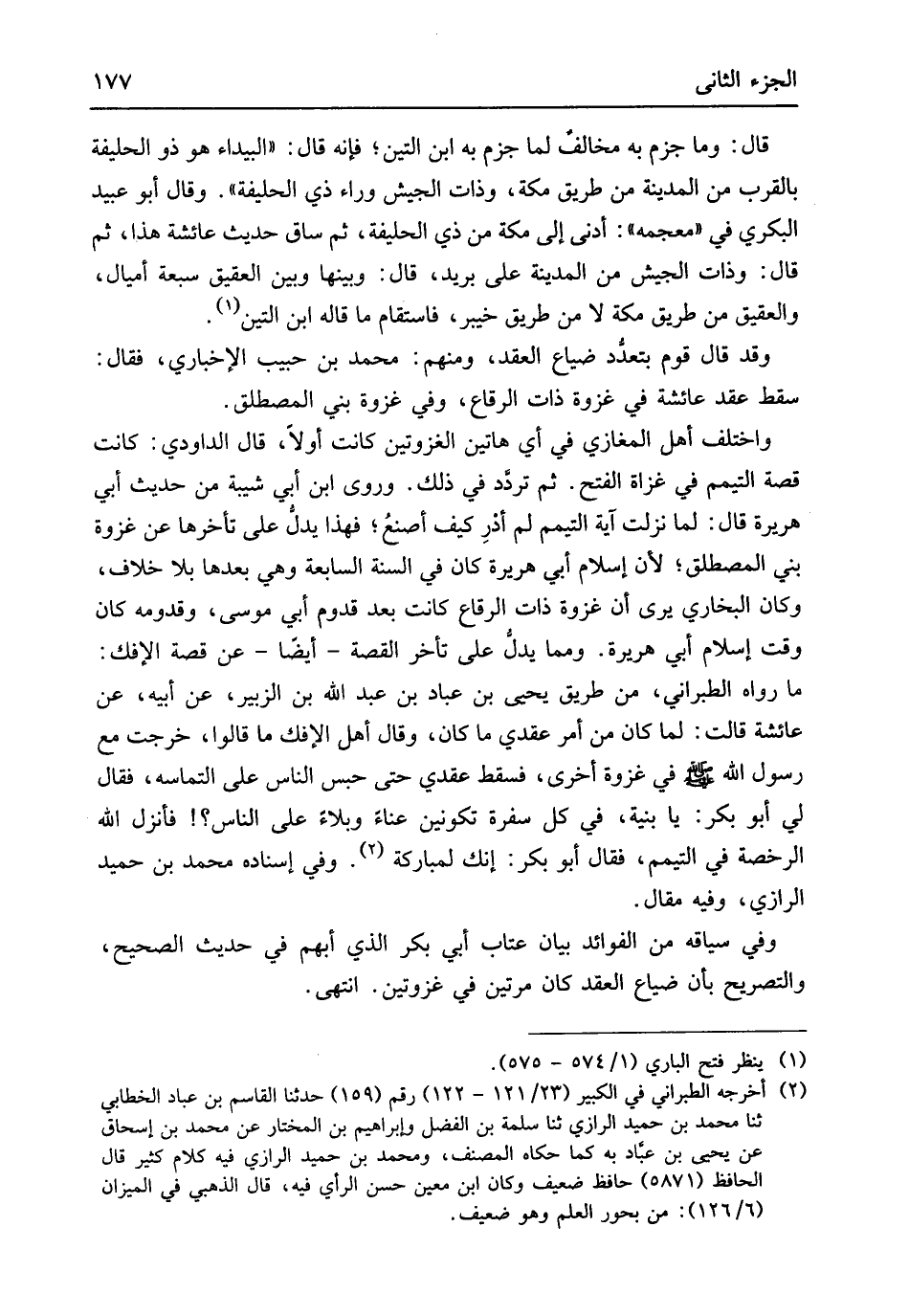 فِي غَزْوَة أُخْرَى فَسقط عقدي حَتَّى حبس النَّاس على التماسه فَقَالَ لي أَبُو بكر يَا بنية فِي كل سفرة تكونين عناءً وبلاءً على النَّاس فَأنْزل الله الرُّخْصَة فِي التَّيَمُّم فَقَالَ أَبُو بكر إِنَّك لمباركة وَفِي إِسْنَاده مُحَمَّد بن حميد الرَّازِيّ وَفِيه مقَال وَفِي سِيَاقه من الْفَوَائِد بَيَان عتاب أبي بكر الَّذِي أبهم فِي حَدِيث الصَّحِيح وَالتَّصْرِيح بِأَن ضيَاع العقد كَانَ مرَّتَيْنِ فِي غزوتين انْتهى