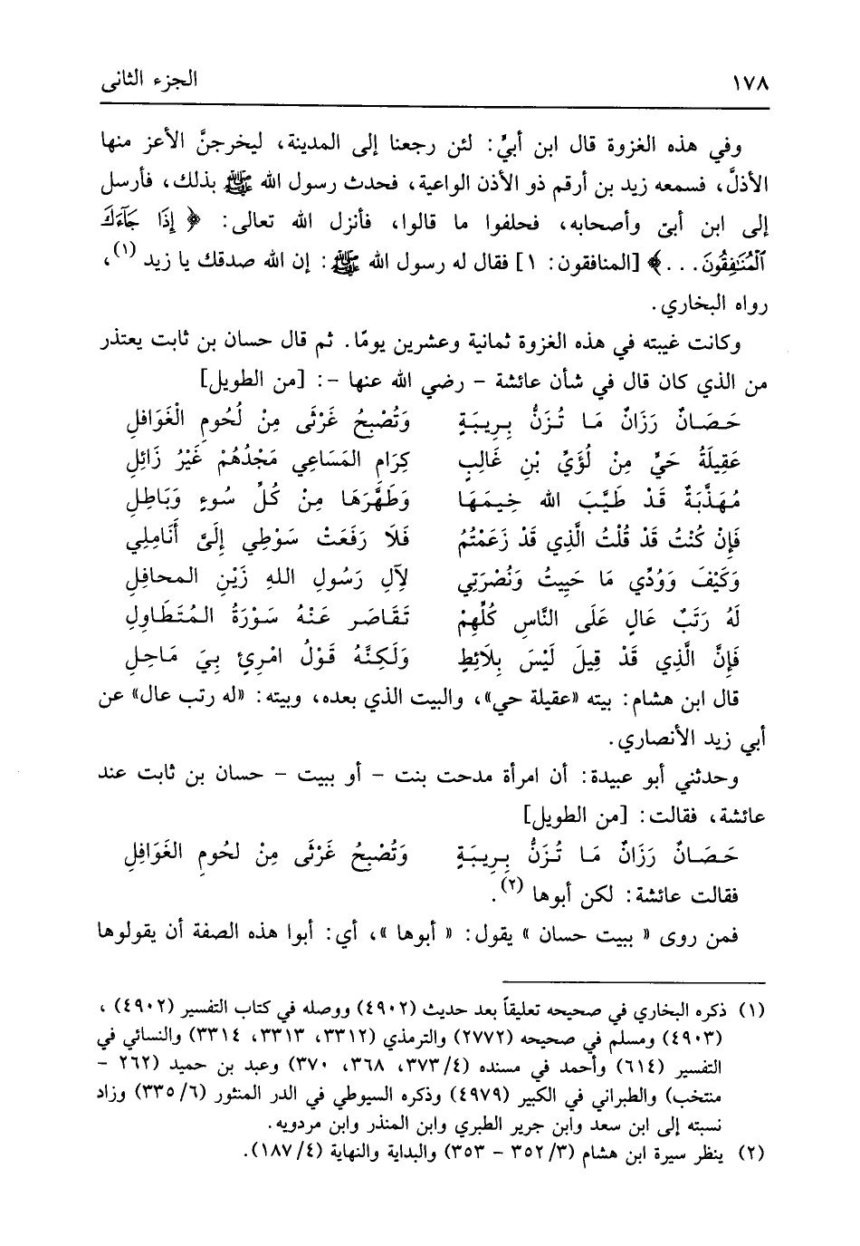 إِن الله صدقك يَا زيد رَوَاهُ البُخَارِيّ وَكَانَت غيبته فِي هَذِه الْغَزْوَة ثَمَانِيَة وَعشْرين يَوْمًا ثمَّ قَالَ حسان بن ثَابت يعْتَذر من الَّذِي كَانَ قَالَ فِي شَأْن عَائِشَة رَضِي الله عَنْهَا // (من الطَّوِيل) //