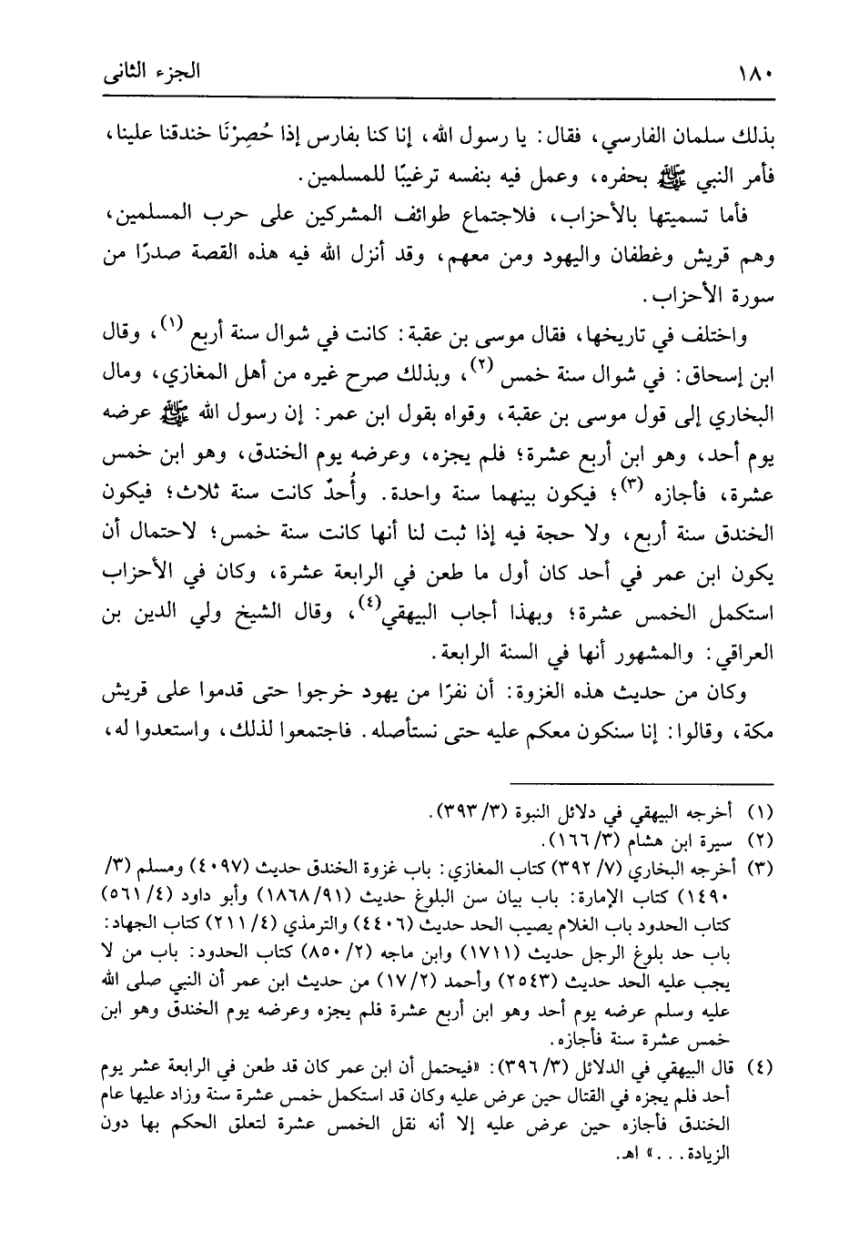 عرضه يَوْم أحد وَهُوَ ابْن أَربع عشرَة فَلم يجزه وَعرضه يَوْم الخَنْدَق وَهُوَ ابْن خمس عشرَة فَأَجَازَهُ فَيكون بَينهمَا سنة وَاحِدَة وأُحدٌ كَانَت سنة ثَلَاث فَيكون الخَنْدَق سنة أَربع وَلَا حجَّة فِيهِ إِذا ثَبت لنا أَنَّهَا كَانَت سنة خمس لاحْتِمَال أَن يكون ابْن عمر فِي أحد كَانَ أول مَا طعن فِي الرَّابِعَة عشرَة وَكَانَ فِي الْأَحْزَاب اسْتكْمل الْخمس عشرَة وَبِهَذَا أجَاب الْبَيْهَقِيّ وَقَالَ الشَّيْخ ولي الدّين بن الْعِرَاقِيّ والمشهرو أَنَّهَا فِي السّنة الرَّابِعَة وَكَانَ من حَدِيث هَذِه الْغَزْوَة أَن نَفرا من يهود خَرجُوا حَتَّى قدمُوا على قُرَيْش مَكَّة وَقَالُوا إِنَّا سنكون مَعكُمْ عَلَيْهِ حَتَّى نستأصله فَاجْتمعُوا لذَلِك واستعدوا لَهُ