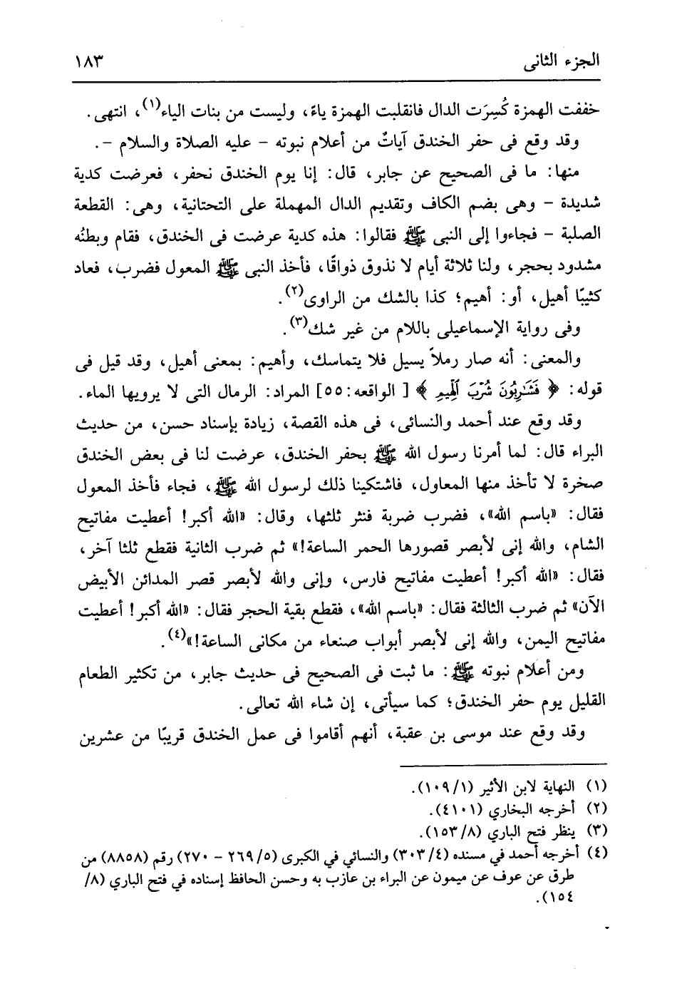 خففت الْهمزَة كُسِرَت الدَّال فَانْقَلَبت الْهمزَة يَاء وَلَيْسَت من بَنَات الْيَاء انْتهى وَقد وَقع فِي حفر الخَنْدَق آيَات من أَعْلَام نبوته عَلَيْهِ الصَّلَاة وَالسَّلَام مِنْهَا مَا فِي الصَّحِيح عَن جَابر قَالَ إِنَّا فِي يَوْم الخَنْدَق نحفر فعرضت كدية شَدِيدَة وَهِي بِضَم الْكَاف وَتَقْدِيم الدَّال الْمُهْملَة على التَّحْتَانِيَّة وَهِي الْقطعَة الصلبة فَجَاءُوا إِلَى النَّبِي