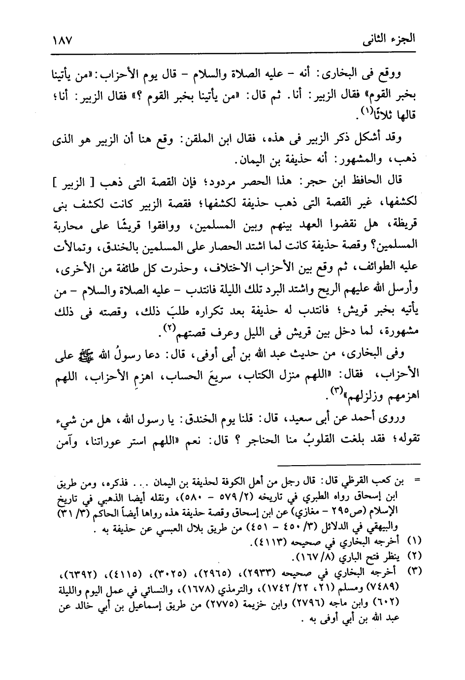 وَوَقع فِي البُخَارِيّ أَنه عَلَيْهِ الصَّلَاة وَالسَّلَام قَالَ يَوْم الْأَحْزَاب من يأتينا بِخَبَر الْقَوْم فَقَالَ الزبير أَنا ثمَّ قَالَ من يأتينا بِخَبَر الْقَوْم فَقَالَ الزبير أَنا قَالَهَا ثَلَاثًا وَقد أشكل ذكر الزبير فِي هَذِه فَقَالَ ابْن الملقن وَقع هُنَا أَن الزبير هُوَ الَّذِي ذهب وَالْمَشْهُور أَنه حُذَيْفَة بن الْيَمَان قَالَ الْحَافِظ ابْن حجر هَذَا الْحصْر مَرْدُود فَإِن الْقِصَّة الَّتِي ذهب الزبير لكشفها غير الْقِصَّة الَّتِي ذهب حُذَيْفَة لكشفها فقصة الزبير كَانَت لكشف بني قُرَيْظَة هَل نقضوا الْعَهْد بَينهم وَبَين الْمُسلمين ووافقوا قُريْشًا على محاربة الْمُسلمين وقصة حُذَيْفَة كَانَت لما اشْتَدَّ الْحصار على الْمُسلمين بالخندق وتمالأت عَلَيْهِ الطوائف ثمَّ وَقع بَين الْأَحْزَاب الِاخْتِلَاف وحذرت كل طَائِفَة من الْأُخْرَى وَأرْسل الله عَلَيْهِم الرّيح وَاشْتَدَّ الْبرد تِلْكَ اللَّيْلَة فَانْتدبَ عَلَيْهِ الصَّلَاة وَالسَّلَام من يَأْتِيهِ بِخَبَر قُرَيْش فَانْتدبَ لَهُ حُذَيْفَة بعد تكراره طلبَ ذَلِك وقصته فِي ذَلِك مَشْهُورَة لما دخل بَين قُرَيْش فِي اللَّيْل وَعرف قصتهم وفى البُخَارِيّ من حَدِيث عبد الله بن أبي أوفى قَالَ دَعَا رسولُ الله