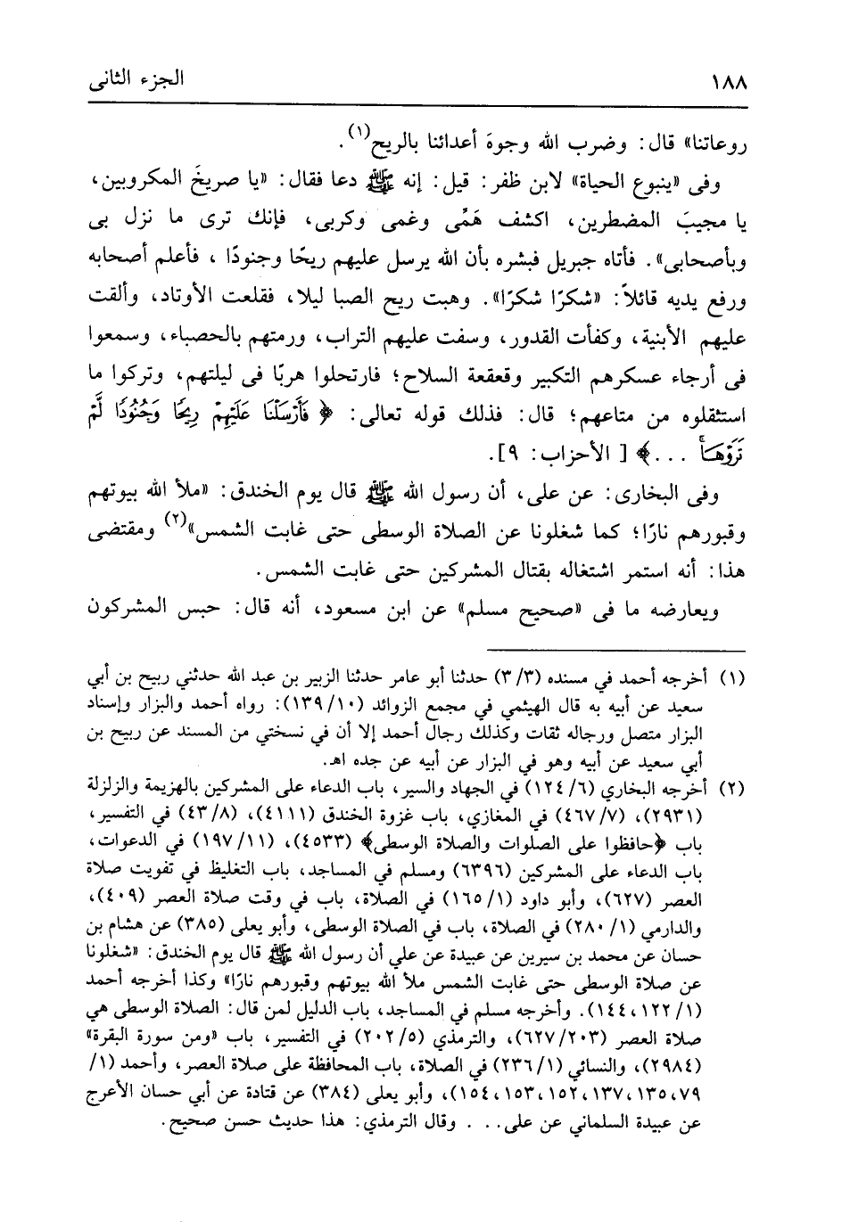 قَالَ يَوْم الخَنْدَق مَلأ الله بُيُوتهم وقبورهم نَارا كَمَا شغلونا عَن الصَّلَاة الْوُسْطَى حَتَّى غَابَتْ الشَّمْس وَمُقْتَضى هَذَا أَنه اسْتمرّ اشْتِغَاله بِقِتَال الْمُشْركين حَتَّى غَابَتْ الشَّمْس ويعارضه مَا فِي // (صَحِيح مُسلم) // عَن ابْن مَسْعُود أَنه قَالَ حبس الْمُشْركُونَ