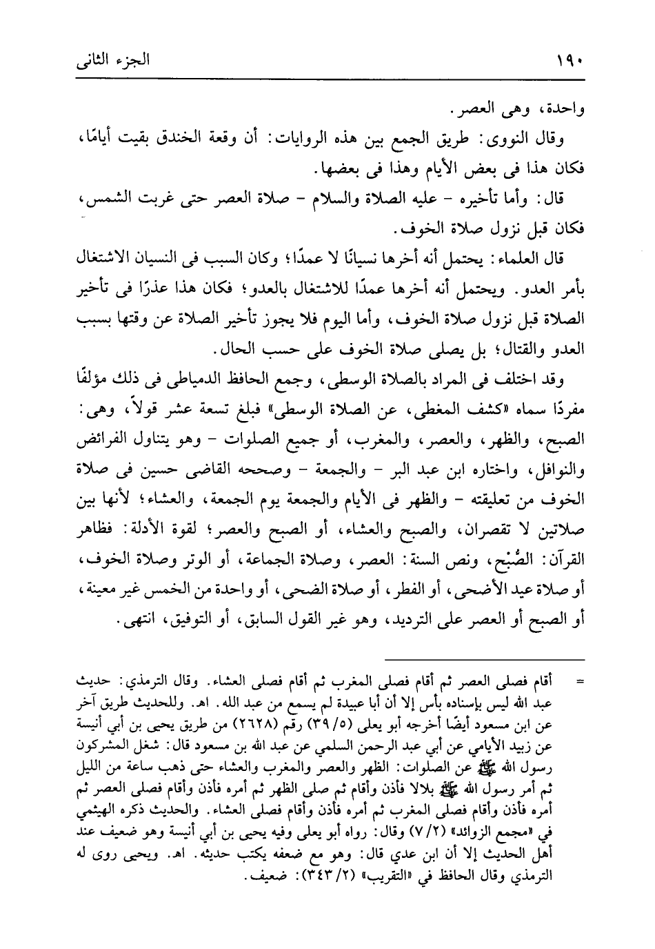وَاحِدَة هِيَ الْعَصْر وَقَالَ النَّوَوِيّ طَرِيق الْجمع بَين هَذِه الرِّوَايَات أَن وقْعَة الخَنْدَق بقيت أَيَّامًا فَكَانَ هَذَا فِي بعض الْأَيَّام وَهَذَا فِي بَعْضهَا قَالَ وَأما تَأْخِيره عَلَيْهِ الصَّلَاة وَالسَّلَام صَلَاة الْعَصْر حَتَّى غربت الشَّمْس فَكَانَ قبل نزُول صَلَاة الْخَوْف قَالَ الْعلمَاء يحْتَمل أَنه آخرهَا نِسْيَانا لَا عمدا وَكَانَ السَّبَب فِي النسْيَان الِاشْتِغَال بِأَمْر الْعَدو وَيحْتَمل أَنه آخرهَا عمدا للاشتغال بالعدو فَكَانَ هَذَا عذرا فِي تَأْخِير الصَّلَاة قبل نزُول صَلَاة الْخَوْف وَأما الْيَوْم فَلَا يجوز تَأْخِير الصَّلَاة عَن وَقتهَا بِسَبَب الْعَدو والقتال بل يُصَلِّي صَلَاة الْخَوْف على حسب الْحَال وَقد اخْتلف فِي المُرَاد بِالصَّلَاةِ الْوُسْطَى وَجمع الْحَافِظ الدمياطي فِي ذَلِك مؤلفاً مُفردا سَمَّاهُ كشف المغطى عَن الصَّلَاة الْوُسْطَى فَبلغ تِسْعَة عشر قولا وهى الصُّبْح وَالظّهْر وَالْعصر وَالْمغْرب أَو جَمِيع الصَّلَوَات وَهُوَ يتَنَاوَل الْفَرَائِض والنوافل وَاخْتَارَهُ ابْن عبد الْبر وَالْجُمُعَة وَصَححهُ القَاضِي حُسَيْن فِي صَلَاة الْخَوْف من تعليقته وَالظّهْر فِي الْأَيَّام وَالْجُمُعَة يَوْم الْجُمُعَة وَالْعشَاء لِأَنَّهَا بَين صَلَاتَيْنِ لَا تقصران وَالصُّبْح وَالْعشَاء أَو الصُّبْح وَالْعصر لقُوَّة الْأَدِلَّة فَظَاهر الْقُرْآن الصُبْح وَنَصّ السّنة الْعَصْر وَصَلَاة الْجَمَاعَة أَو الْوتر وَصَلَاة الْخَوْف أَو صَلَاة عيد الْأَضْحَى أَو الْفطر أَو صَلَاة الضُّحَى أَو وَاحِدَة من الْخمس غير مُعينَة أَو الصُّبْح أَو الْعَصْر على الترديد وَهُوَ غير القَوْل السَّابِق أَو التَّوْفِيق انْتهى
