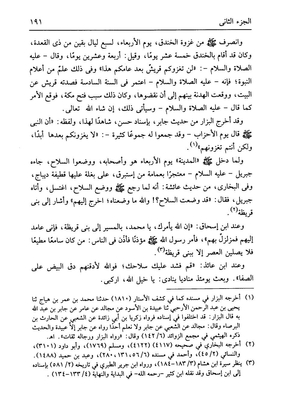 من غَزْوَة الخَنْدَق يَوْم الْأَرْبَعَاء لسبع لَيَال بَقينَ من ذِي الْقعدَة وَكَانَ قد أَقَامَ بالخندق خَمْسَة عشر يَوْمًا وَقيل أَرْبَعَة وَعشْرين يَوْمًا وَقَالَ عَلَيْهِ الصلاه وَالسَّلَام لن تغزوكم بعد عامكم هَذَا وفى ذَلِك علم من أَعْلَام النُّبُوَّة فَإِنَّهُ عَلَيْهِ الصَّلَاة وَالسَّلَام اعْتَمر فِي السّنة السَّادِسَة فصدته قُرَيْش عَن الْبَيْت وَوَقعت الْهُدْنَة بَينهم إِلَى أَن نقضوها وَكَانَ ذَلِك سَبَب فتح مَكَّة فَوَقع الْأَمر كَمَا قَالَ عَلَيْهِ الصَّلَاة وَالسَّلَام وسيأتى ذَلِك إِن شَاءَ الله تَعَالَى وَقد أخرج الْبَزَّار من حَدِيث جَابر بِإِسْنَاد حسن شَاهدا لهَذَا وَلَفظه أَن النَّبِي