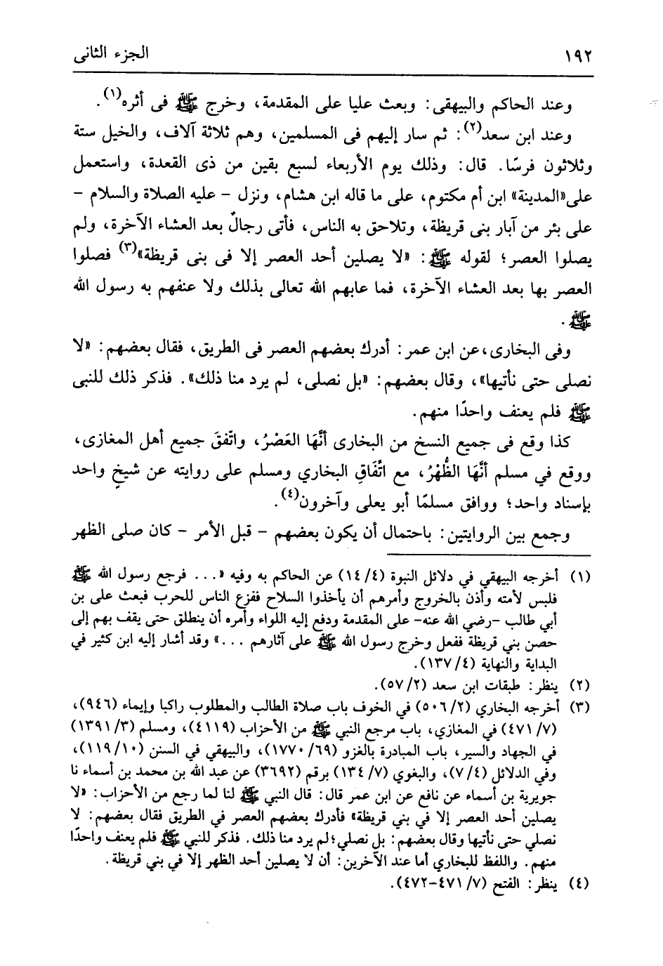 لَا يصلين أحد الْعَصْر إِلَّا فِي بني قُرَيْظَة فصلوا الْعَصْر بهَا بعد الْعشَاء الْآخِرَة فَمَا عابهم الله تَعَالَى بذلك وَلَا عنفهم بِهِ رَسُول الله