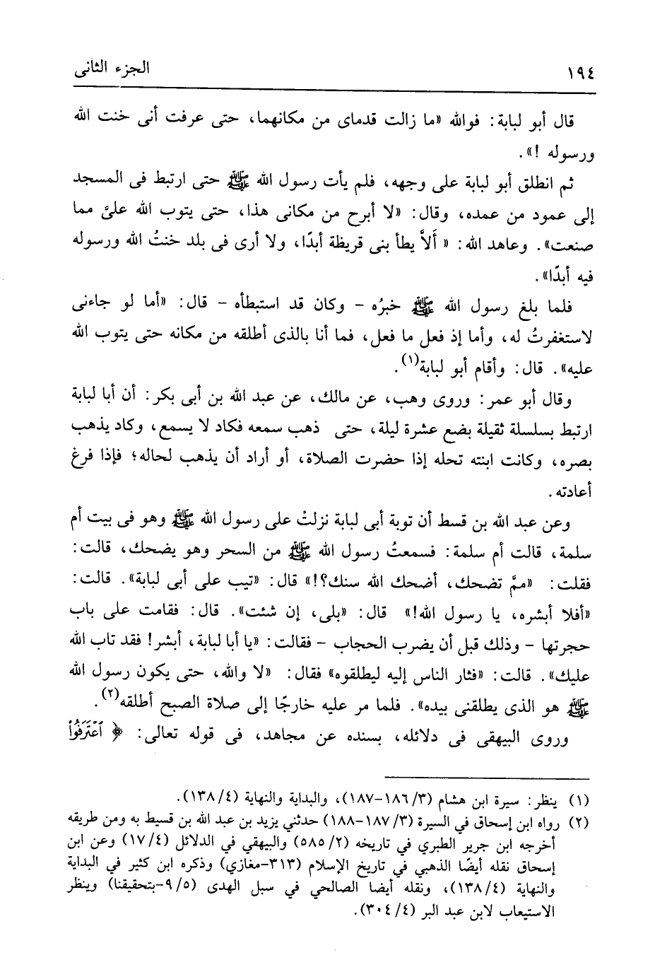 خبرُه وَكَانَ قد اسْتَبْطَأَهُ قَالَ أما لَو جَاءَنِي لاستغفرتُ لَهُ وَأما إِذْ فعل مَا فعل فَمَا أَنا بِالَّذِي أطلقهُ من مَكَانَهُ حَتَّى يَتُوب الله عَلَيْهِ قَالَ وَأقَام أَبُو لبَابَة وَقَالَ أَبُو عمر وروى وهب عَن مَالك عَن عبد الله بن أبي بكر أَن أَبَا لبَابَة ارْتبط بسلسلة ثَقيلَة بضع عشرَة لَيْلَة حَتَّى ذهب سَمعه فكاد لَا يسمع وَكَاد يذهب بَصَره وَكَانَت ابْنَته تحله إِذا حضرت الصَّلَاة أَو أَرَادَ أَن يذهب لحاله فَإِذا فرغ أعادته وَعَن عبد الله بن قسط أَن تَوْبَة أبي لبَابَة نزلت على رَسُول الله