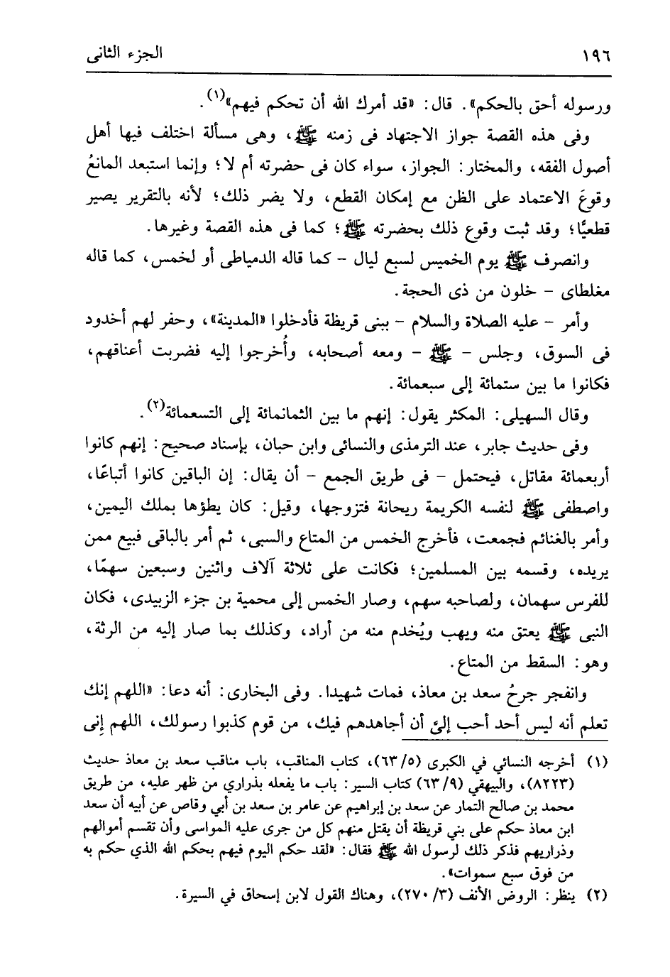 وَمَعَهُ أَصْحَابه وأُخرجوا إِلَيْهِ فَضربت أَعْنَاقهم فَكَانُوا مَا بَين سِتّمائَة إِلَى سَبْعمِائة وَقَالَ السُّهيْلي المكثر يَقُول إِنَّهُم مَا بَين الثَّمَانمِائَة إِلَى التسْعمائَة وفى حَدِيث جَابر عِنْد التِّرْمِذِيّ وَالنَّسَائِيّ وَابْن حبَان بِإِسْنَاد صَحِيح إِنَّهُم كَانُوا أَرْبَعمِائَة مقَاتل فَيحْتَمل فِي طَرِيق الْجمع أَن يُقَال إِن البَاقِينَ كَانُوا أتباعا وَاصْطفى