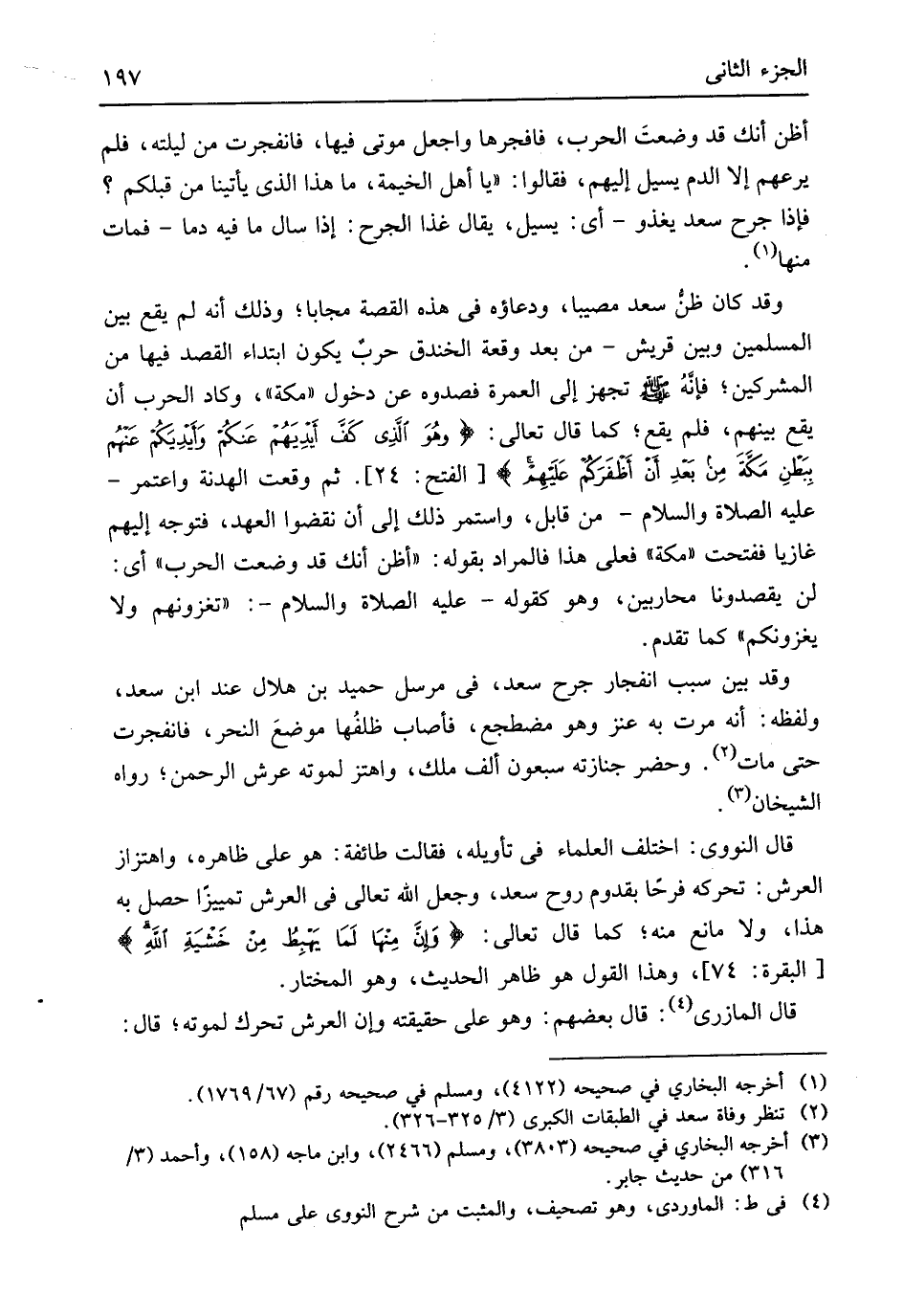 تجهز إِلَى الْعمرَة فصدوه عَن دُخُول مَكَّة وَكَاد الْحَرْب أَن يَقع بَينهم فَلم يَقع كَمَا قَالَ تَعَالَى {وهُوَ اَلذي كَفَّ أيديَهُم عَنْكُم وَأَيْدِيكُمْ عنهُم بِبَطنِ مَكَةَ من بَعدِ أَن أَظْفَرَكم عَلَيْهِم} ثمَّ وَقعت الْهُدْنَة وَاعْتمر عَلَيْهِ الصَّلَاة وَالسَّلَام من قَابل وَاسْتمرّ ذَلِك إِلَى أَن نقضوا الْعَهْد فَتوجه إِلَيْهِم غازياً ففتحت مَكَّة فعلى هَذَا فَالْمُرَاد بقوله أَظن أَنَّك قد وضعت الْحَرْب أَي لن يقصدونا محاربين وَهُوَ كَقَوْلِه عَلَيْهِ الصَّلَاة وَالسَّلَام تغزونهم وَلَا يغزونكم كَمَا تقدم وَقد بَين سَبَب انفجار جرح سعد فِي مُرْسل حميد بن هِلَال عِنْد ابْن سعد وَلَفظه أَنه مرت بِهِ عنز وَهُوَ مُضْطَجع فَأصَاب ظلفُها موضعَ النَّحْر فانفجرت حَتَّى مَاتَ وَحضر جنَازَته سَبْعُونَ ألف ملك واهتز لمَوْته عرش الرَّحْمَن // (رَوَاهُ الشَّيْخَانِ) // قَالَ النَّوَوِيّ اخْتلف الْعلمَاء فِي تَأْوِيله فَقَالَت طَائِفَة هُوَ على ظَاهره واهتزاز الْعَرْش تحركه فَرحا بقدوم روح سعد وَجعل الله تَعَالَى فِي الْعَرْش تمييزاً حصل بِهِ هَذَا وَلَا مَانع مِنْهُ كَمَا قَالَ تَعَالَى {وَإن مِنهَا لَمَا يهبِطُ من خَشْيَة الله} وَهَذَا القَوْل هُوَ ظَاهر الحَدِيث وَهُوَ الْمُخْتَار قَالَ الْمَازرِيّ قَالَ بَعضهم وَهُوَ على حَقِيقَته وَإِن الْعَرْش تحرّك لمَوْته قَالَ