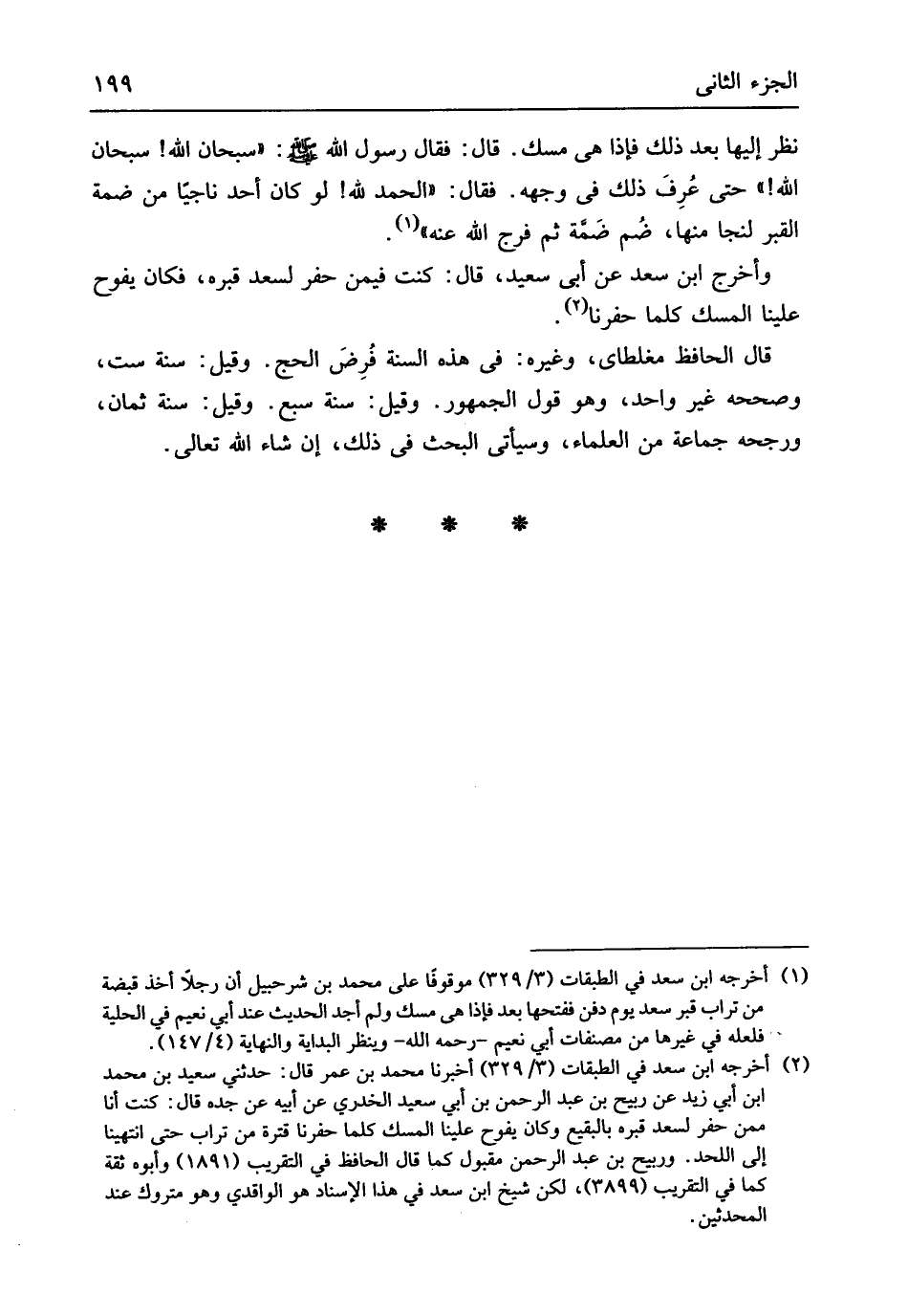 سُبْحَانَ الله سُبْحَانَ الله حَتَّى عُرِفَ ذَلِك فِي وَجهه فَقَالَ الْحَمد لله لَو كَانَ أحد ناجياً من ضمة الْقَبْر لنجا مِنْهَا ضُم ضَمّة ثمَّ فرج الله عَنهُ وَأخرج ابْن سعد عَن أبي سعيد قَالَ كنت فِيمَن حفر لسعد قَبره فَكَانَ يفوح علينا الْمسك كلما حفرنا قَالَ الْحَافِظ مغلطاي وَغَيره فِي هَذِه السّنة فُرِضَ الْحَج وَقيل سنة سِتّ وَصَححهُ غير وَاحِد وَهُوَ قَول الْجُمْهُور وَقيل سنة سبع وَقيل سنة ثَمَان وَرجحه جمَاعَة من الْعلمَاء وَسَيَأْتِي الْبَحْث فِي ذَلِك إِن شَاءَ الله تَعَالَى