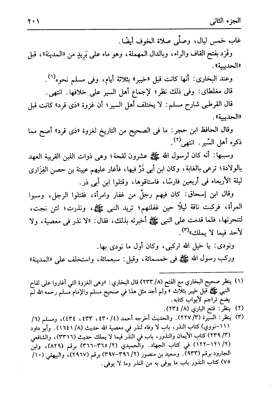 غَابَ خمس لَيَال وَصلى صَلَاة الْخَوْف أَيْضا وقَرَد بِفَتْح الْقَاف وَالرَّاء وبالدال الْمُهْملَة وَهُوَ مَاء على بَرِيد من الْمَدِينَة قبل الْحُدَيْبِيَة وَعند البُخَارِيّ أَنَّهَا كَانَت قبل خَيْبَر بِثَلَاثَة أَيَّام وفى مُسلم نَحوه قَالَ مغلطاي وفى ذَلِك نظر لإِجْمَاع أهل السّير على خلَافهَا انْتهى قَالَ الْقُرْطُبِيّ شَارِح مُسلم لَا يخْتَلف أهل السّير أَن غَزْوَة ذِي قرد كَانَت قبل الْحُدَيْبِيَة وَقَالَ الْحَافِظ ابْن حجر مَا فِي الصَّحِيح من التَّارِيخ لغزوة ذِي قرد أصح مِمَّا ذكره أهل السّير انْتهى وسببها أَنه كَانَ لرَسُول الله
