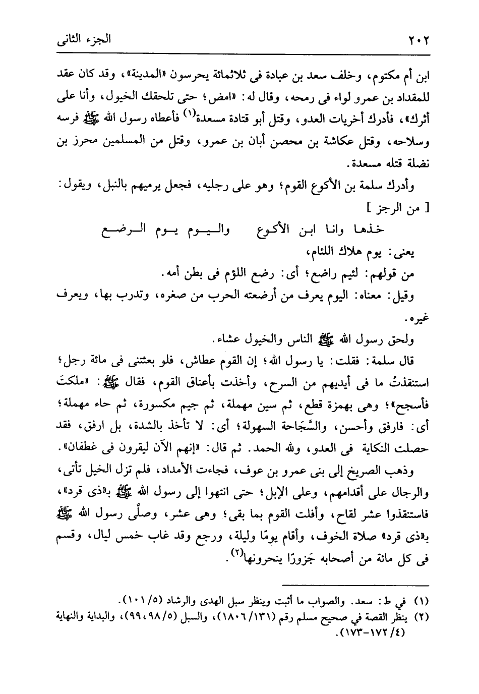 فرسه وسلاحه وَقتل عكاشة بن مُحصن أبان بن عَمْرو وَقتل من الْمُسلمين مُحرز بن نَضْلَة قَتله مسْعدَة وَأدْركَ سَلمَة بن الْأَكْوَع الْقَوْم وَهُوَ على رجلَيْهِ فَجعل يرميهم بِالنَّبلِ وَيَقُول // (من الرجز) //