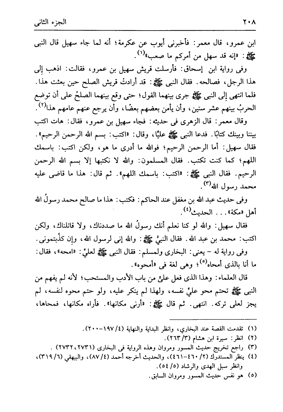 اكْتُبْ بِاسْمِك اللَّهُمَّ ثمَّ قَالَ هَذَا مَا قاضى عَلَيْهِ مُحَمَّد رَسُول الله وَفِي حَدِيث عبد الله بن مُغفل عِنْد الْحَاكِم فَكتب هَذَا مَا صَالح مُحَمَّد رسولُ الله أهل مَكَّة ... الحَدِيث فَقَالَ سُهَيْل وَالله لَو كُنَّا نعلم أَنَّك رسولُ الله مَا صَدَدْنَاك وَلَا قَاتَلْنَاك وَلَكِن اكْتُبْ مُحَمَّد بن عبد الله فَقَالَ النَّبِي