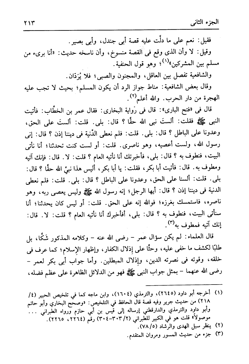 فَقيل نعم على مَا دلّت عَلَيْهِ قصَّة أبي جندل وَأبي بَصِير وَقيل لَا وَأَن الَّذِي وَقع فِي الْقِصَّة مَنْسُوخ وَأَن ناسخه حَدِيث أَنا بَرِيء من مُسلم بَين الْمُشْركين وَهُوَ قَول الْحَنَفِيَّة وَالشَّافِعِيَّة تفصل بَين الْعَاقِل وَالْمَجْنُون وَالصَّبِيّ فَلَا يُرَدان وَقَالَ بعض الشَّافِعِيَّة منَاط جَوَاز الرَّد أَن يكون الْمُسلم بِحَيْثُ لَا تجب عَلَيْهِ الْهِجْرَة من دَار الْحَرْب وَالله أعلم قَالَ فِي فتح الْبَارِي قَالَ فِي رِوَايَة البُخَارِيّ فَقَالَ عمر بن الخطَاب فَأتيت النَّبِي