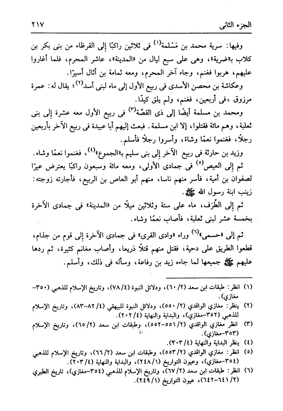 وفيهَا سَرِيَّة مُحَمَّد بن مَسلمة فِي ثَلَاثِينَ رَاكِبًا إِلى القرظاء من بني بكر بن كلاب بضرية وَهِي على سبع لَيَال من الْمَدِينَة عَاشر الْمحرم فَلَمَّا أَغَارُوا عَلَيْهِم هربوا فعنم وَجَاء آخر الْمحرم وَمَعَهُ ثُمَامَة بن أَثَال أَسِيرًا وعكاشة بن مُحصن الْأَسدي فِي ربيع الأول إِلَى مَاء لبني أَسد يُقَال لَهُ عمْرَة مَرْزُوق فِي أَرْبَعِينَ فغنم وَلم يلق كيداً وَمُحَمّد بن مسلمة أَيْضا إِلَى ذِي القصَة فِي ربيع الأول مَعَه عشرَة إِلى بني ثَعْلَبَة وهم مائَة فَقتلُوا إِلَّا ابْن مسلمة فَبعث إِلَيْهِم أَبَا عُبَيْدَة فِي ربيع الآخر بِأَرْبَعِينَ رجلا فغنموا نعما وَشاء وأسروا رجلا فَأسلم وَزيد بن حَارِثَة فِي ربيع الآخر إِلى بني سليم بالجموع فغنموا نعما وَشاء ثمَّ إِلى الْعيص فِي جُمَادَى الأولى وَمَعَهُ مائَة وَسَبْعُونَ رَاكِبًا يعْتَرض عيرًا لِصَفْوَان بن أُميَّة فَأسر مِنْهُم نَاسا مِنْهُم أَبُو الْعَاصِ بن الرّبيع فَأَجَارَتْهُ زَوجته زَيْنَب ابْنة رَسُول الله