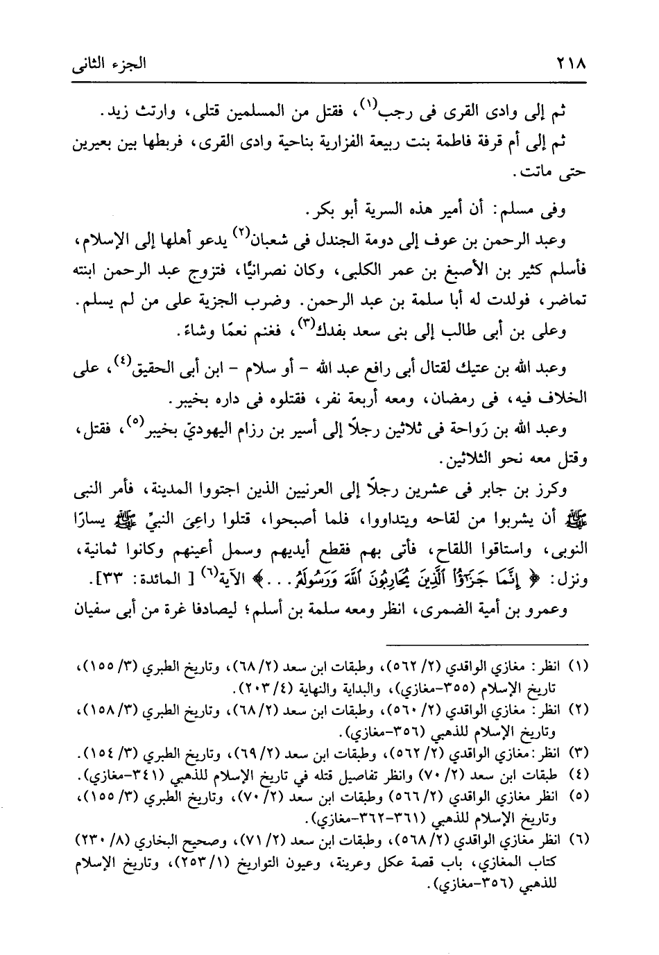 ثمَّ إِلَى وادى الْقرى فِي رَجَب فَقتل من الْمُسلمين قَتْلَى وَارْتثَّ زيد ثمَّ إِلَى أم قرفة فَاطِمَة بنت ربيعَة الفزارية بِنَاحِيَة وَادي الْقرى فربطها بَين بَعِيرَيْنِ حَتَّى مَاتَت وَفِي مُسلم أَن أَمِير هَذِه السّريَّة أَبُو بكر وَعبد الرَّحْمَن بن عَوْف إِلَى دومة الجندل فِي شعْبَان يَدْعُو أَهلهَا إِلَى الْإِسْلَام فَأسلم كثير بن الْأَصْبَغ بن عمر الْكَلْبِيّ وَكَانَ نَصْرَانِيّا فَتزَوج عبد الرَّحْمَن ابْنَته تماضر فَولدت لَهُ أَبَا سَلمَة بن عبد الرَّحْمَن وَضرب الْجِزْيَة على من لم يسلم وَعلي بن أبي طَالب إِلَى بني سعد بِفَدَكَ فغنم نعما وَشاء وَعبد الله بن عتِيك لقِتَال أبي رَافع عبد الله أَو سَلام ابْن أبي الْحقيق على الْخلاف فِيهِ فِي رَمَضَان وَمَعَهُ أَرْبَعَة نفر فَقَتَلُوهُ فِي دَاره بِخَيْبَر وَعبد الله بن رَواحة فِي ثَلَاثِينَ رجلا إِلَى أَسِير بن رزام الْيَهُودِيّ بِخَيْبَر فَقتل وَقتل مَعَه نَحْو الثَّلَاثِينَ وكرز بن جَابر فِي عشْرين رجلا إِلَى العرنيين الَّذين اجتووا الْمَدِينَة فَأمر النَّبِي