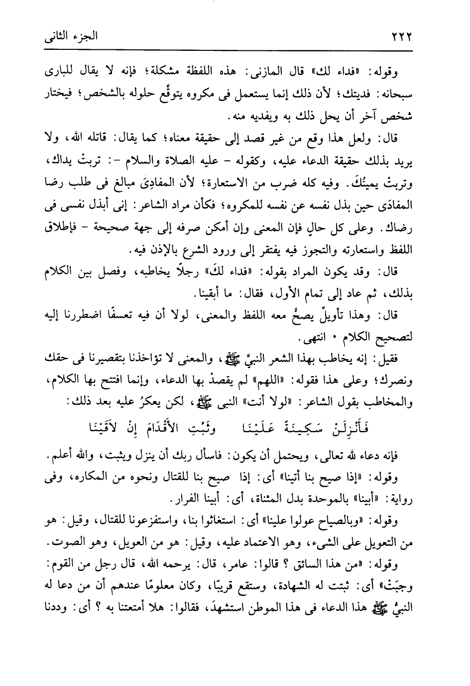 وَقَوله فدَاء لَك قَالَ الْمَازِني هَذِه اللَّفْظَة مشكلة فَإِنَّهُ لَا يُقَال للباري سُبْحَانَهُ فديتك لِأَن ذَلِك إِنَّمَا يسْتَعْمل فِي مَكْرُوه يتَوَقَّع حُلُوله بالشخص فيختار شخص آخر أَن يحل ذَلِك بِهِ ويفديه مِنْهُ قَالَ وَلَعَلَّ هَذَا وَقع من غير قصد إِلَى حَقِيقَة مَعْنَاهُ كَمَا يُقَال قَاتله الله وَلَا يُرِيد بذلك حَقِيقَة الدُّعَاء عَلَيْهِ وَكَقَوْلِه عَلَيْهِ الصَّلَاة وَالسَّلَام تربتْ يداك وتربت يمينُكَ وَفِيه كُله ضرب من الِاسْتِعَارَة لِأَن المفادِيَ مبالغ فِي طلب رضَا المفادَى حِين بذل نَفسه عَن نَفسه للمكروه فَكَأَن مُرَاد الشَّاعِر إِنِّي أبذل نَفسِي فِي رضاك وعَلى كل حالٍ فَإِن الْمَعْنى وَإِن أمكن صرفه إِلَى جِهَة صَحِيحَة فإطلاق اللَّفْظ واستعارته والتجوز فِيهِ يفْتَقر إِلَى وُرُود الشَّرْع بِالْإِذْنِ فِيهِ قَالَ وَقد يكون المُرَاد بقوله فدَاء لكَ رجلا يخاطبه وَفصل بَين الْكَلَام بذلك ثمَّ عَاد إِلَى تَمام الأول فَقَالَ مَا أبقينا قَالَ وَهَذَا تَأْوِيل يصحُ مَعَه اللَّفْظ وَالْمعْنَى لَوْلَا أَن فِيهِ تعسفاً اضطررنا إِلَيْهِ لتصحيح الْكَلَام انْتهى فَقيل إِنَّه يُخَاطب بِهَذَا الشّعْر النَّبِي