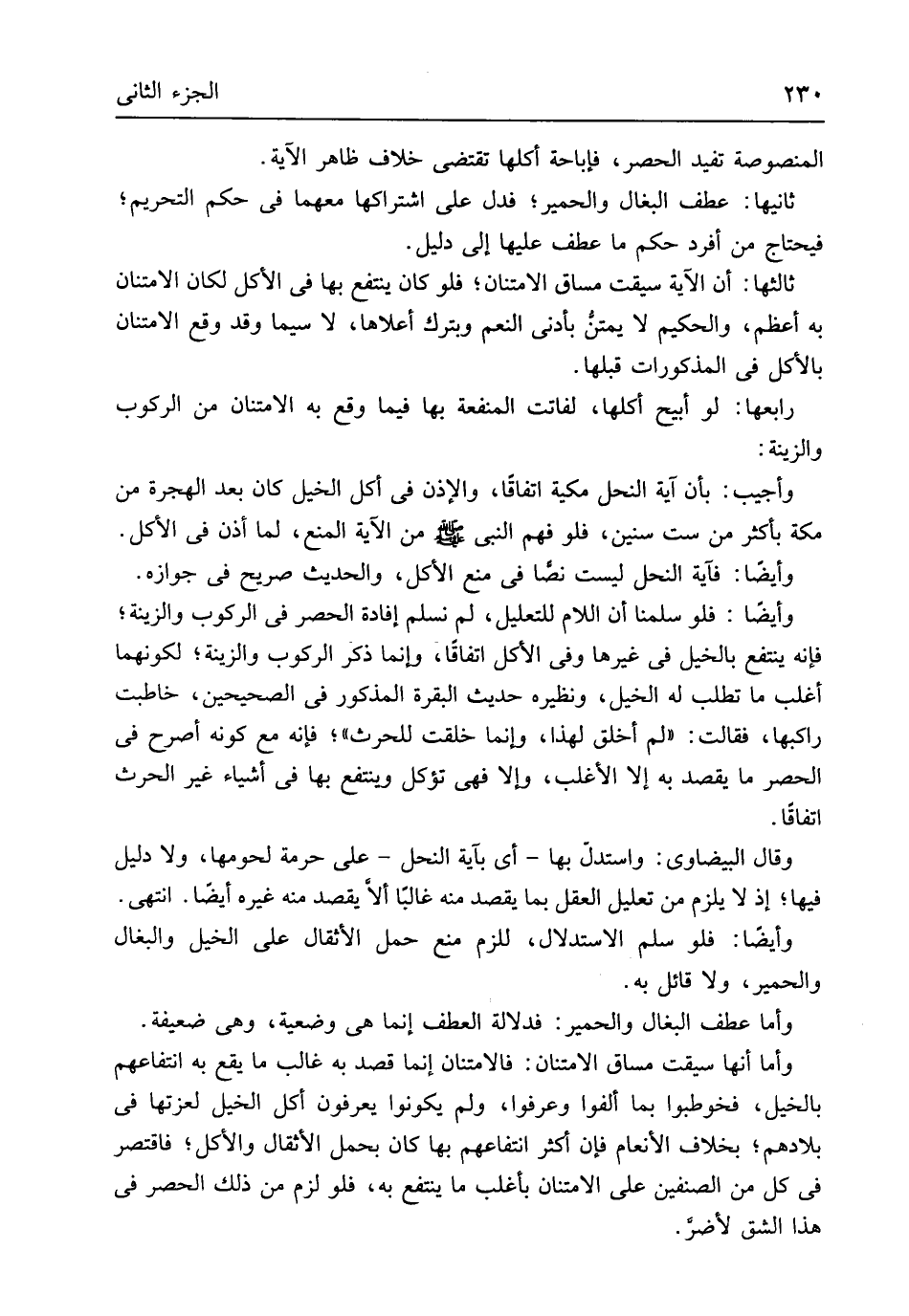المنصوصة تفِيد الْحصْر فإباحة أكلهَا تَقْتَضِي خلاف ظَاهر الْآيَة ثَانِيهَا عطف البغال وَالْحمير فَدلَّ على اشتراكها مَعَهُمَا فِي حكم التَّحْرِيم فَيحْتَاج من أفرد حكم مَا عطف عَلَيْهَا إِلَى دَلِيل ثَالِثهَا أَن الْآيَة سيقت مساق الامتنان فَلَو كَانَ ينْتَفع بهَا فِي الْأكل لَكَانَ الامتنان بِهِ أعظم والحكيم لَا يمتن بِأَدْنَى النعم وبترك أَعْلَاهَا لَا سِيمَا وَقد وَقع الامتنان بِالْأَكْلِ فِي الْمَذْكُورَات قبلهَا رَابِعهَا لَو أُبِيح أكلهَا لفاتت الْمَنْفَعَة بهَا فِيمَا وَقع بِهِ الامتنان من الرّكُوب والزينة وَأجِيب بِأَن آيَة النَّحْل مَكِّيَّة اتِّفَاقًا وَالْإِذْن فِي أكل الْخَيل كَانَ بعد الْهِجْرَة من مَكَّة بِأَكْثَرَ من سِتّ سِنِين فَلَو فهم النَّبِي