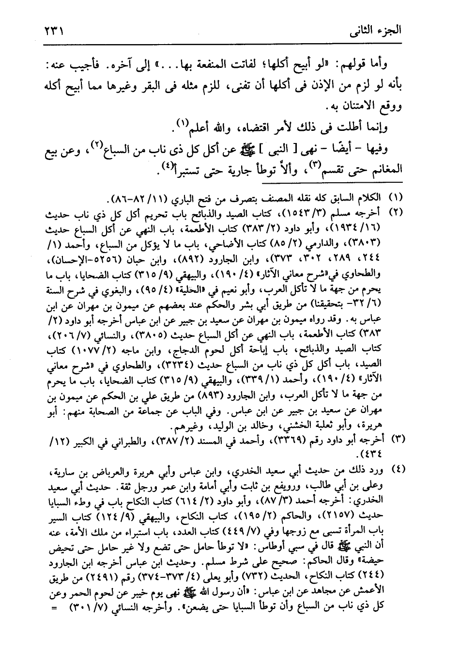 وَأما قَوْلهم لَو أُبِيح أكلهَا لفاتت الْمَنْفَعَة بهَا. . إِلَى آخِره فَأُجِيب عَنهُ بِأَنَّهُ لَو لزم من الْإِذْن فِي أكلهَا أَن تفنى للَزِمَ مثله فِي الْبَقر وَغَيرهَا مِمَّا أُبِيح أكله وَوَقع الامتنان بِهِ وَإِنَّمَا أطلت فِي ذَلِك لأمر اقْتَضَاهُ وَالله أعلم وفيهَا أَيْضا نهى النَّبِي