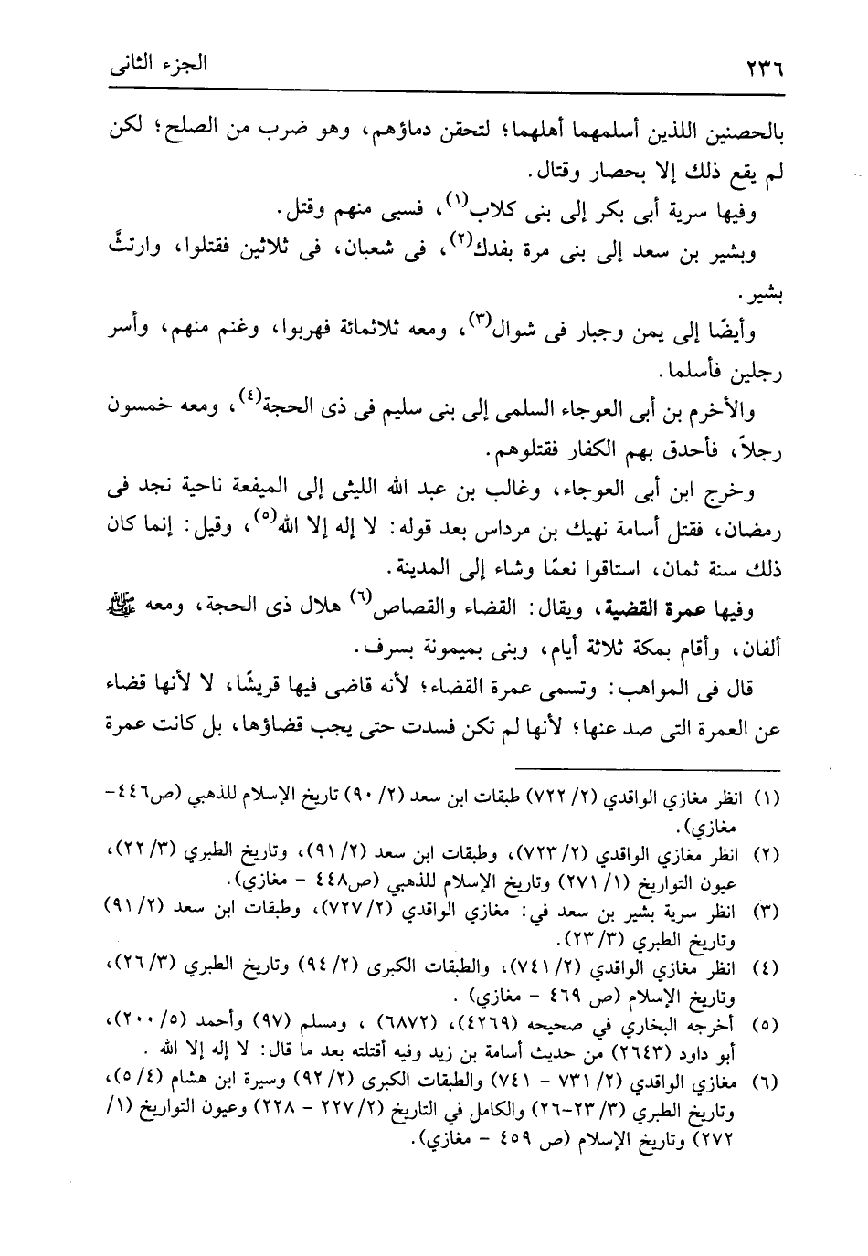 بالحصنين اللَّذين أسلمهما أهلهما لتحقن دِمَاؤُهُمْ وَهُوَ ضرب من الصُّلْح لَكِن لم يَقع ذَلِك إِلَّا بحصار وقتال وفيهَا سَرِيَّة أبي بكر إِلَى بني كلاب فسبى مِنْهُم وَقتل وَبشير بن سعد إِلَى بني مرّة بِفَدَكَ فِي شعْبَان فِي ثَلَاثِينَ فَقتلُوا وَارْتثَّ بشير وأيضَا إِلَى يمن وجبار فِي شَوَّال وَمَعَهُ ثَلَاثمِائَة فَهَرَبُوا وغنم مِنْهُم وَأسر رجلَيْنِ فَأَسْلمَا والأخرم بن أبي العوجاء السّلمِيّ إِلَى بني سليم فِي ذِي الْحجَّة وَمَعَهُ خَمْسُونَ رجلا فأحدق بهم الْكفَّار فَقَتَلُوهُمْ وَخرج ابْن أبي العوجاء وغالب بن عبد الله الليثى إِلَى الْمِيفَعَة نَاحيَة نجد فِي رَمَضَان فَقتل أُسَامَة نهيك بن مرداس بعد قَوْله لَا إِلَه إِلَّا الله وَقيل إِنَّمَا كَانَ ذَلِك سنة ثَمَان استاقوا نعما وَشاء إِلَى الْمَدِينَة وفيهَا عمْرَة الْقَضِيَّة وَيُقَال الْقَضَاء وَالْقصاص هِلَال ذِي الْحجَّة وَمَعَهُ