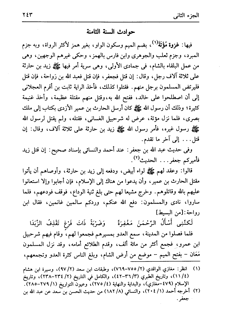 فِيهَا غَزْوَة مُؤْتَةَ بِضَم الْمِيم وَسُكُون الْوَاو بِغَيْر همز لأكْثر الروَاة وَبِه جزم الْمبرد وَجزم ثَعْلَب والجوهري وَابْن فَارس بِالْهَمْز وَحكى غَيرهم الْوَجْهَيْنِ وَهِي من عمل البلقاء بِالشَّام فِي جُمَادَى الأولى وَهِي سَرِيَّة أَمر فِيهَا