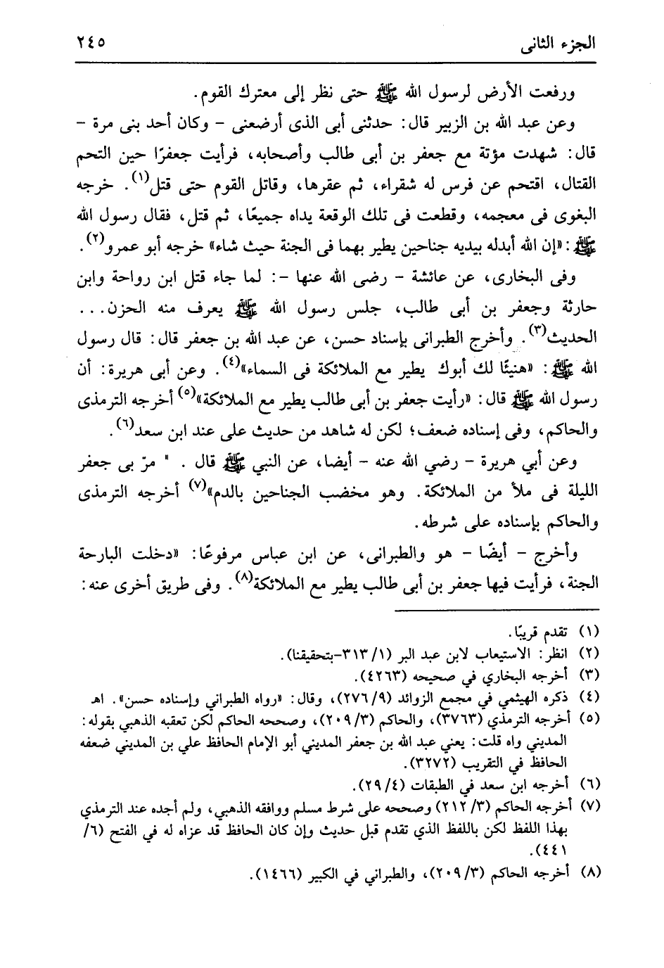 حَتَّى نظر إِلَى معترك الْقَوْم وَعَن عبد الله بن الزبير قَالَ حَدثنِي أبي الَّذِي أرضعني وَكَانَ أحد بني مرّة قَالَ شهِدت مُؤْتَة مَعَ جَعْفَر بن أبي طَالب وَأَصْحَابه فَرَأَيْت جعفراً حِين التحم الْقِتَال اقتحم عَن فرس لَهُ شقراء ثمَّ عقرهَا وَقَاتل الْقَوْم حَتَّى قتل خرجه الْبَغَوِيّ فِي مُعْجَمه وَقطعت فِي تِلْكَ الْوَقْعَة يَدَاهُ جَمِيعًا ثمَّ قتل فَقَالَ رَسُول الله