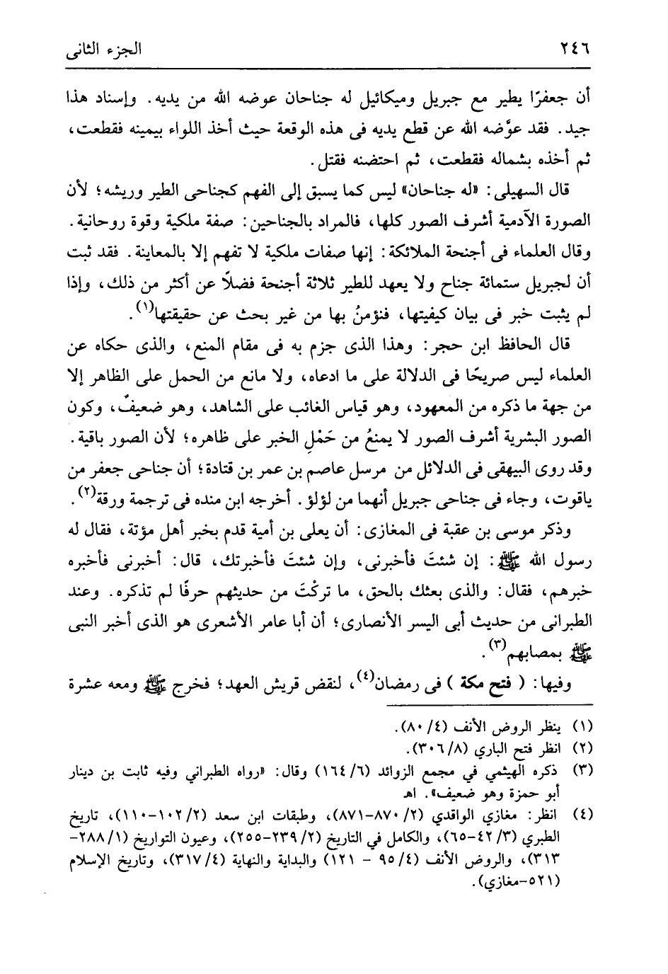 أَن جعفراً يطير مَعَ جِبْرِيل وَمِيكَائِيل لَهُ جَنَاحَانِ عوضه الله من يَدَيْهِ وَإسْنَاد هَذَا جيد فقد عوّضه الله عَن قطع يَدَيْهِ فِي هَذِه الْوَقْعَة حَيْثُ أَخذ اللِّوَاء بِيَمِينِهِ فَقطعت ثمَّ أَخذه بِشمَالِهِ فَقطعت ثمَّ احتضنه فَقتل قَالَ السُّهيْلي لَهُ جَنَاحَانِ لَيْسَ كَمَا يسْبق إِلَى الْفَهم كجناحي الطير وريشه لِأَن الصُّورَة الْآدَمِيَّة أشرف الصُّور كلهَا فَالْمُرَاد بالجناحين صفة ملكية وَقُوَّة روحانية وَقَالَ الْعلمَاء فِي أَجْنِحَة الْمَلَائِكَة إِنَّهَا صِفَات ملكية لَا تفهم إِلَّا بالمعاينة فقد ثَبت أَن لجبريل سِتّمائَة جنَاح وَلَا يعْهَد للطير ثَلَاثَة أَجْنِحَة فضلا عَن أَكثر من ذَلِك وَإِذا لم يثبت خبر فِي بَيَان كيفيتها فنؤمنُ بهَا من غير بحث عَن حَقِيقَتهَا قَالَ حَافظ ابْن حجر وَهَذَا الَّذِي جزم بِهِ فِي مقَام الْمَنْع وَالَّذِي حَكَاهُ عَن الْعلمَاء لَيْسَ صَرِيحًا فِي الدّلَالَة على مَا ادَّعَاهُ وَلَا مَانع من الْحمل على الظَّاهِر إِلَّا من جِهَة مَا ذكره من الْمَعْهُود وَهُوَ قِيَاس الْغَائِب على الشَّاهِد وَهُوَ ضعيفٌ وَكَون الصُّور البشرية أشرف الصُّور لَا يمنعُ من حَمْلِ الْخَبَر على ظَاهره لِأَن الصُّور بَاقِيَة وَقد روى الْبَيْهَقِيّ فِي الدَّلَائِل من مُرْسل عَاصِم بن عمر بن قَتَادَة أَن جناحي جَعْفَر من ياقوت وَجَاء فِي جناحي جِبْرِيل أَنَّهُمَا من لُؤْلُؤ أخرجه ابْن مَنْدَه فِي تَرْجَمَة ورقة وَذكر مُوسَى بن عقبَة فِي الْمَغَازِي أَن يعلى بن أُميَّة قدم بِخَبَر أهل مُؤْتَة فَقَالَ لَهُ رَسُول الله