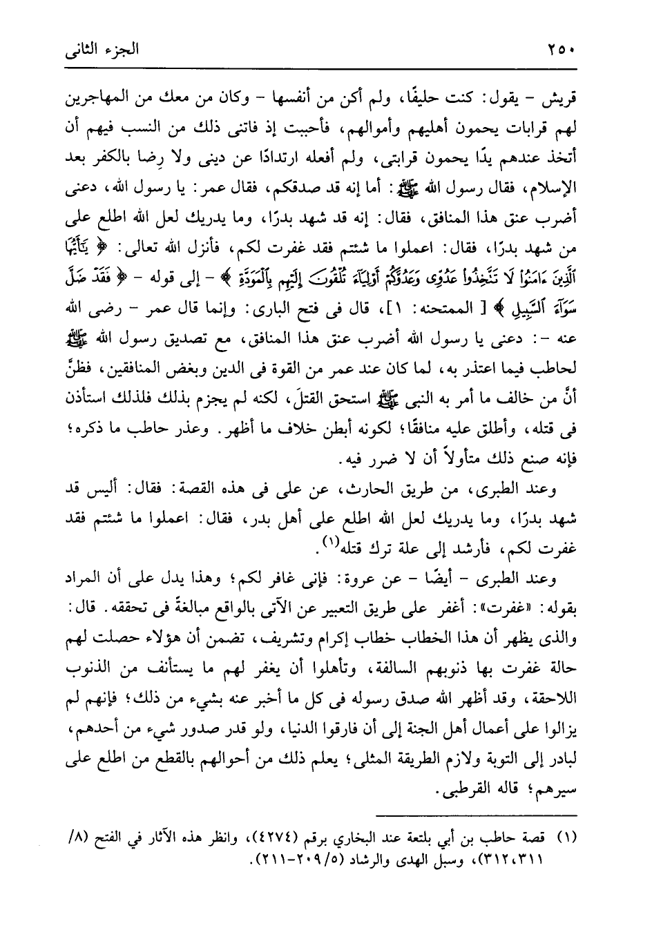 قُرَيْش يَقُول كنت حليفاً وَلم أكن من أَنْفسهَا وَكَانَ من مَعَك من الْمُهَاجِرين لَهُم قَرَابَات يحْمُونَ أَهْليهمْ وَأَمْوَالهمْ فَأَحْبَبْت إِذْ فَاتَنِي ذَلِك من النّسَب فيهم أَن أَتَّخِذ عِنْدهم يدا يحْمُونَ قَرَابَتي وَلم أَفعلهُ ارْتِدَادًا عَن ديني وَلَا رِضاً بالْكفْر بعد الْإِسْلَام فَقَالَ رَسُول الله