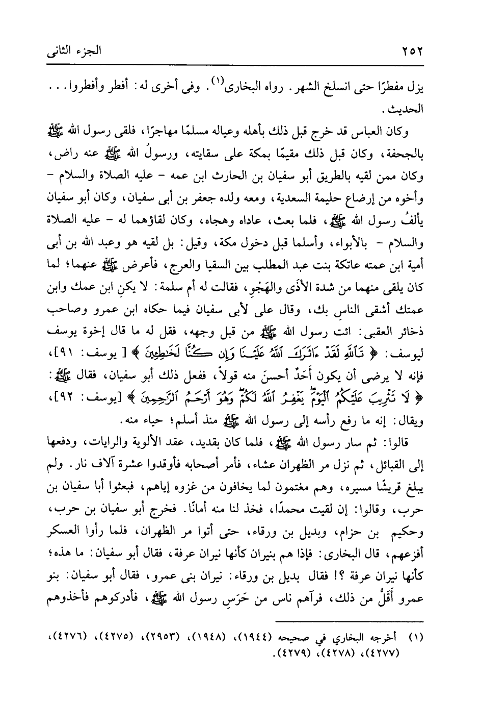 يزل مُفطرا حَتَّى انْسَلَخَ الشَّهْر رَوَاهُ البُخَارِيّ وَفِي أُخْرَى لَهُ أفطر وأفطروا ... الحَدِيث وَكَانَ الْعَبَّاس قد خرج قبل ذَلِك بأَهْله وَعِيَاله مُسلما مُهَاجرا فلقي رَسُول الله