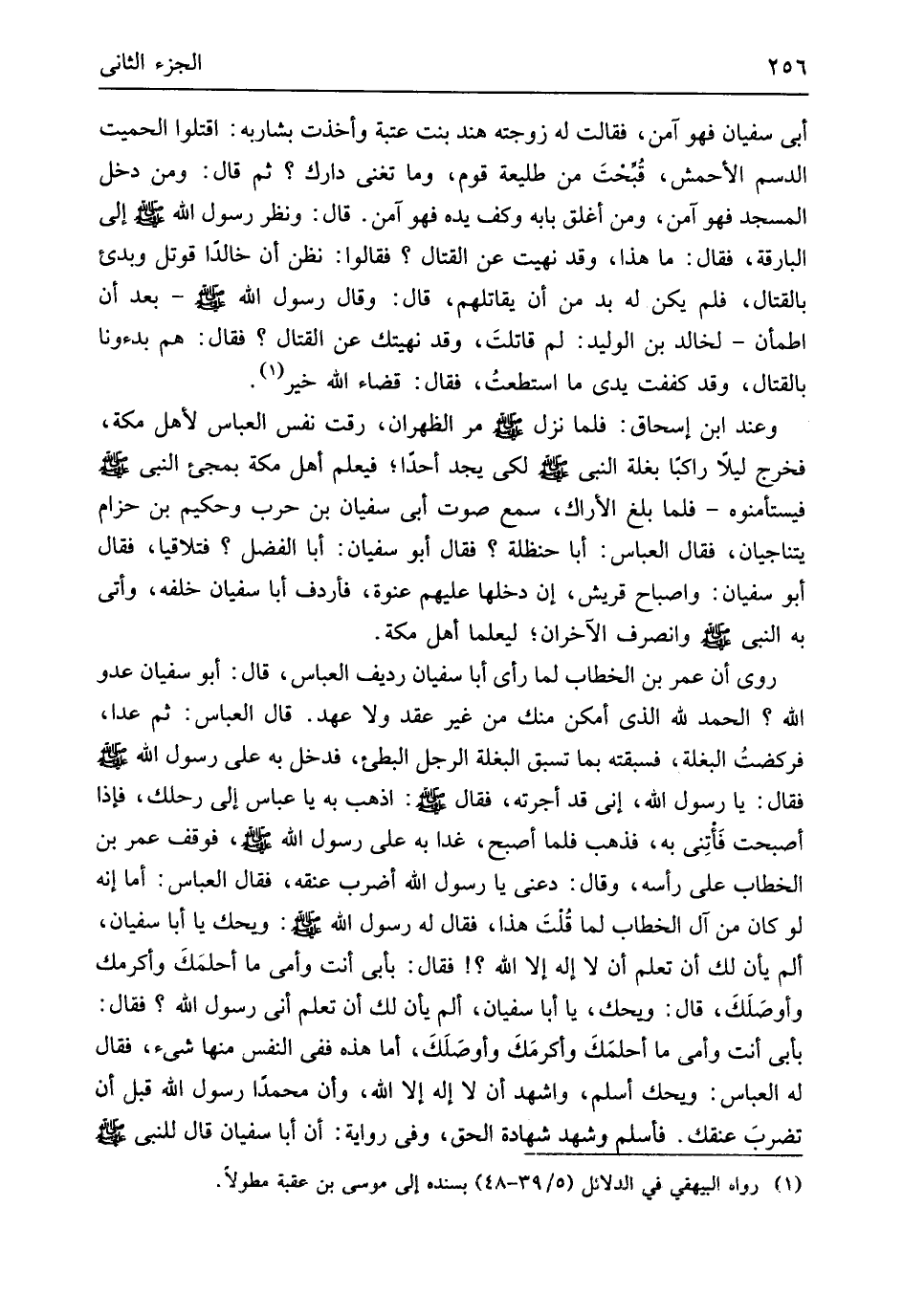 وَانْصَرف الْآخرَانِ ليعلما أهل مَكَّة روى أَن عمر بن الْخطاب لما رأى أَبَا سُفْيَان رَدِيف الْعَبَّاس قَالَ أَبُو سُفْيَان عَدو الله الْحَمد لله الَّذِي أمكن مِنْك من غير عقد وَلَا عهد قَالَ الْعَبَّاس ثمَّ عدا فركضتُ البغلة فسبقته بِمَا تسبق البغلة الرجل البطيء فَدخل بِهِ على رَسُول الله
