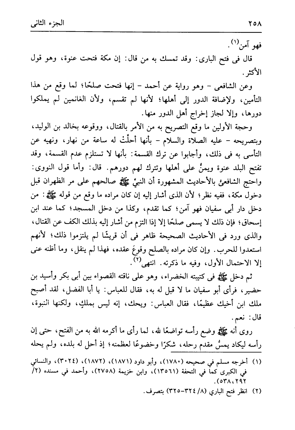 من دخل دَار أبي سُفْيَان فَهُوَ آمن كَمَا تقدم وَكَذَا من دخل الْمَسْجِد كَمَا عِنْد ابْن إِسْحَاق فَإِن ذَلِك لَا يُسمى صلحا إِلَّا إِذا الْتزم من أَشَارَ إِلَيْهِ بذلك الْكَفّ عَن الْقِتَال وَالَّذِي ورد فِي الْأَحَادِيث الصَّحِيحَة ظَاهر فِي أَن قُريْشًا لم يلتزموا ذَلِك لأَنهم اسْتَعدوا للحرب وَإِن كَانَ مُرَاده بِالصُّلْحِ وقوعَ عقده فَهَذَا لم ينْقل وَمَا أَظُنهُ عَنى إِلَّا الِاحْتِمَال الأول وَفِيه مَا ذكرته انْتهى ثمَّ دخل