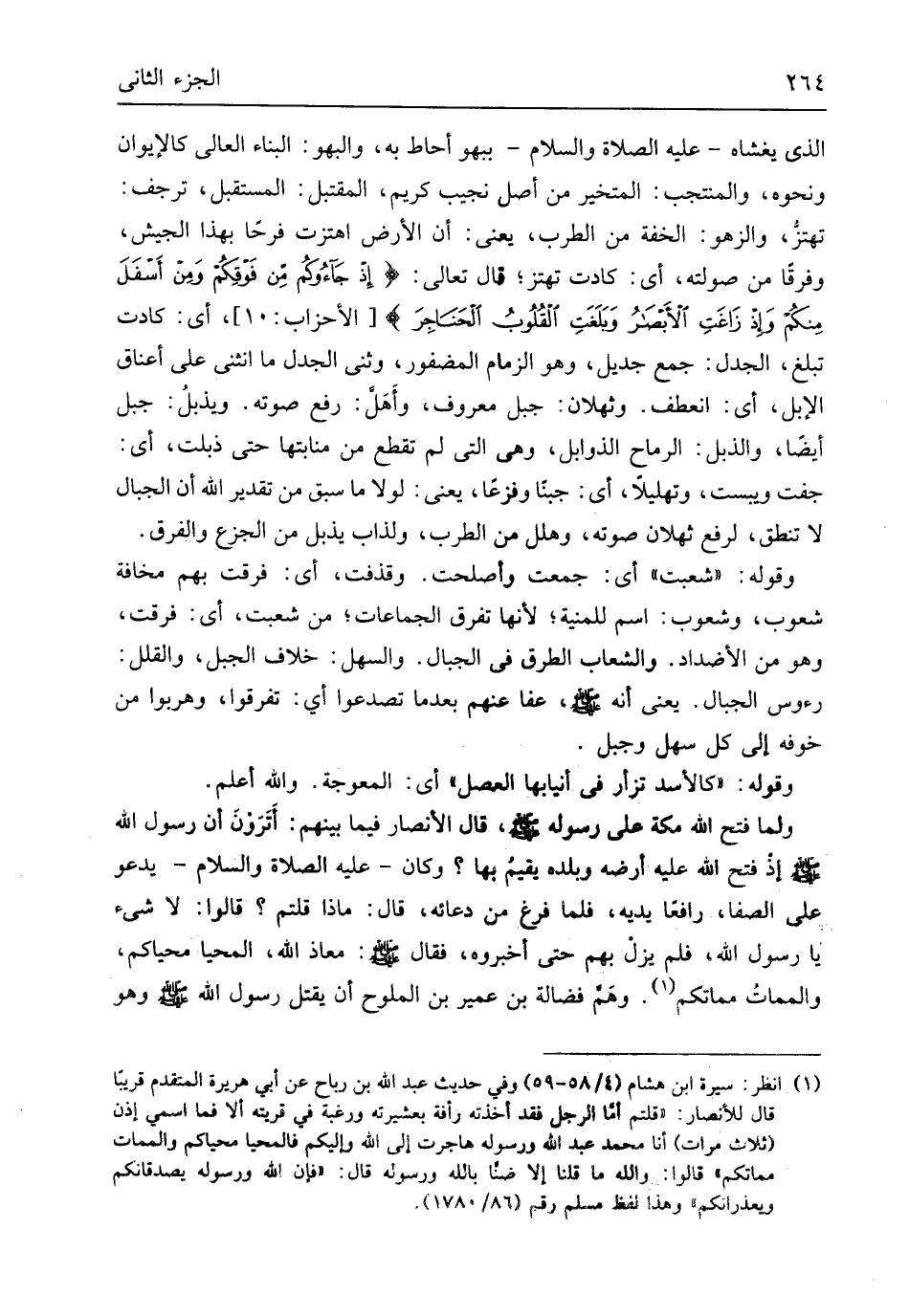 الَّذِي يَغْشَاهُ عَلَيْهِ الصَّلَاة وَالسَّلَام ببهو أحَاط بِهِ والبهو الْبناء العالي كالإيوان وَنَحْوه والمنتجب المتخير من أصل نجيب كريم المقتبل الْمُسْتَقْبل ترجف تهتز والزهو الخفة من الطَّرب يَعْنِي أَن الأَرْض اهتزت فَرحا بِهَذَا الْجَيْش وفرقاً من صولته أَي كَادَت تهتز قَالَ تَعَالَى {إِذ جَاءُوكم مِن فَوقكِم وَمِن أسفَلَ مِنكُم وَإِذ زاغت الْأَبْصَار وَبَلغت الْقُلُوب الحنجر} أَي كَادَت تبلغ الجدل جمع جديل وَهُوَ الزِّمَام المضفور وَثني الجدل مَا انثنى على أَعْنَاق الْإِبِل أَي انعطف وثهلان جبل مَعْرُوف وأهَلَ رفع صَوته ويذبلُ جبل أَيْضا والذبل الرماح الذوابل وَهِي الَّتِي لم تقطع من منابتها حَتَّى ذبلت أَي جَفتْ ويبست وتهليلاً أَي جبنا وفزعاً يَعْنِي لَوْلَا مَا سبق من تَقْدِير الله أَن الْجبَال لَا تنطق لرفع ثهلان صَوته وَهَلل من الطَّرب ولذاب يذبل من الْجزع وَالْفرق وَقَوله شعبت أَي جمعت وأصلحت وقذفت أَي فرقت بهم مَخَافَة شعوب وشعوب اسْم للمنية لِأَنَّهَا تفرق الْجَمَاعَات من شعبت أَي فرقت وَهُوَ من الأضداد والشعاب الطّرق فِي الْجبَال والسهل خلاف الْجَبَل والقلل رُءُوس الْجبَال يَعْنِي أَنه