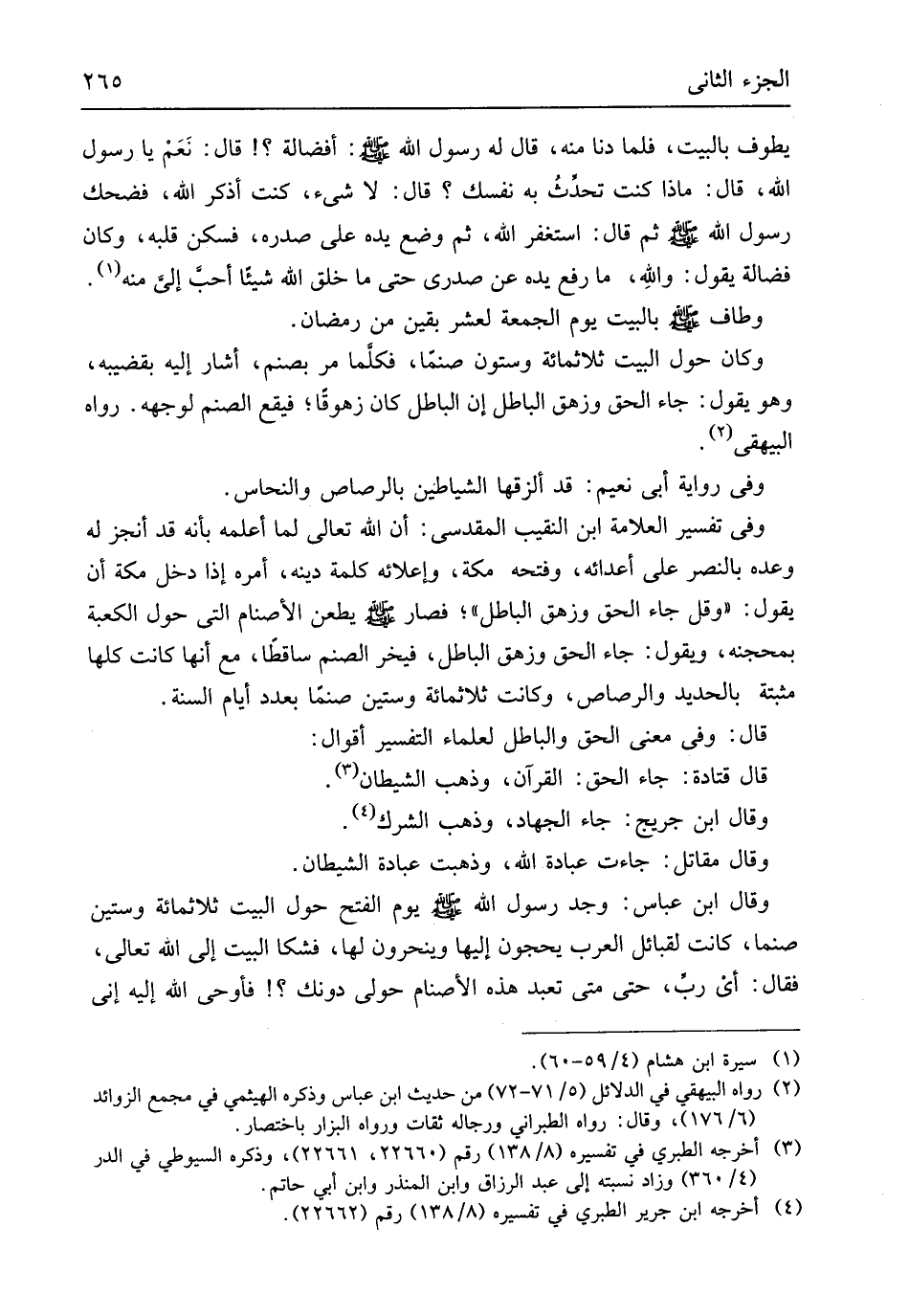 يطعن الْأَصْنَام الَّتِي حول الْكَعْبَة بِمِحْجَنِهِ وَيَقُول جَاءَ الْحق وزهق الْبَاطِل فيخر الصَّنَم سَاقِطا مَعَ أَنَّهَا كَانَت كلهَا مثبتة بالحديد والرصاص وَكَانَت ثَلَاثمِائَة وَسِتِّينَ صنماً بِعَدَد أَيَّام السّنة قَالَ وَفِي معنى الْحق وَالْبَاطِل لعلماء التَّفْسِير أَقْوَال قَالَ قَتَادَة جَاءَ الْحق الْقُرْآن وَذهب الشَّيْطَان وَقَالَ ابْن جريج جَاءَ الْجِهَاد وَذهب الشّرك وَقَالَ مقَاتل جَاءَت عبَادَة الله وَذَهَبت عبَادَة الشَّيْطَان وَقَالَ ابْن عَبَّاس وجد رَسُول الله
