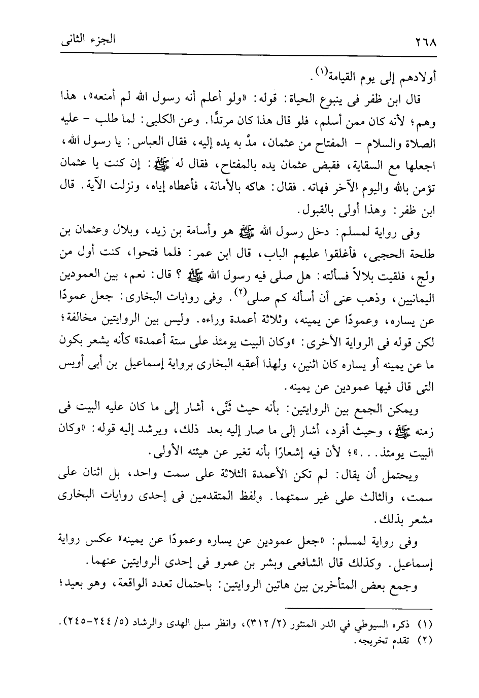 أَوْلَادهم إِلَى يَوْم الْقِيَامَة قَالَ ابْن ظفر فِي ينبوع الْحَيَاة قَوْله وَلَو أعلم أَنه رَسُول الله لم أمْنَعهُ هَذَا وهم لِأَنَّهُ كَانَ مِمَّن أسلم فَلَو قَالَ هَذَا كَانَ مُرْتَدا وَعَن الْكَلْبِيّ لما طلب عَلَيْهِ الصَّلَاة وَالسَّلَام الْمِفْتَاح من عُثْمَان مد بِهِ يَده إِلَيْهِ فَقَالَ الْعَبَّاس يَا رَسُول الله اجْعَلْهَا مَعَ السِّقَايَة فَقبض عُثْمَان يَده بالمفتاح فَقَالَ لَهُ