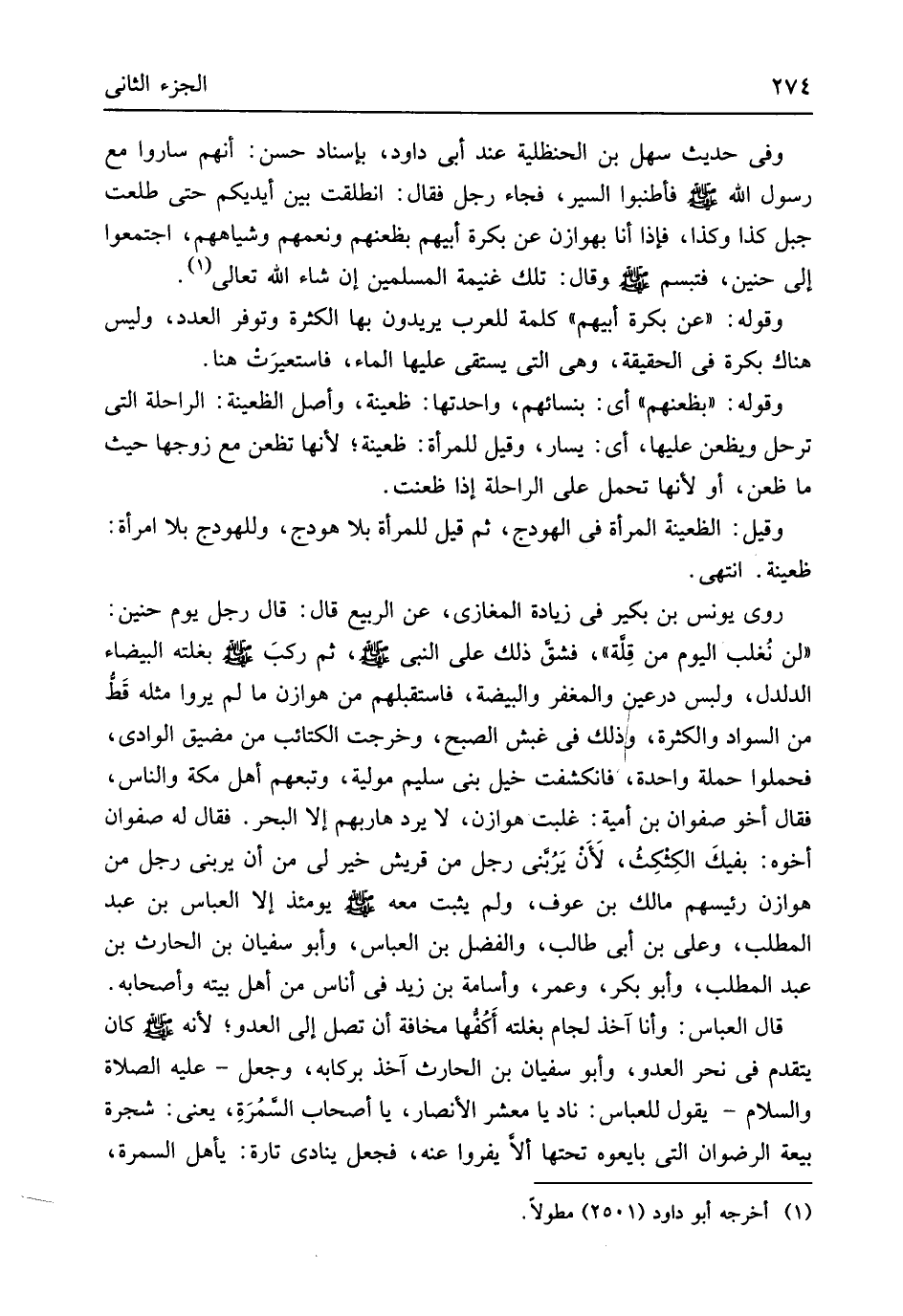 وَقَالَ تِلْكَ غنيمَة الْمُسلمين إِن شَاءَ الله تَعَالَى وَقَوله عَن بكرَة أَبِيهِم كلمة للْعَرَب يُرِيدُونَ بهَا الْكَثْرَة وتوفر الْعدَد وَلَيْسَ هُنَاكَ بكرَة فِي الْحَقِيقَة وَهِي الَّتِي يستقى عَلَيْهَا المَاء فاستعيرَتْ هُنَا وَقَوله بظعنهم أَي بنسائهم واحدتها ظَعِينَة وأصل الظعينة الرَّاحِلَة الَّتِي ترحل ويظعن عَلَيْهَا أَي يسَار وَقيل للْمَرْأَة ظَعِينَة لِأَنَّهَا تظعن مَعَ زَوجهَا حَيْثُ مَا ظعن أَو لِأَنَّهَا تحمل على الرَّاحِلَة إِذا ظعنت وَقيل الظعينة الْمَرْأَة فِي الهودج ثمَّ قيل للْمَرْأَة بِلَا هودج وللهودج بِلَا امْرَأَة ظَعِينَة انْتهى روى يُونُس بن بكير فِي زِيَادَة الْمَغَازِي عَن الرّبيع قَالَ قَالَ رجل يَوْم حنين لن نُغلب الْيَوْم من قِلة فشق ذَلِك على النَّبِي