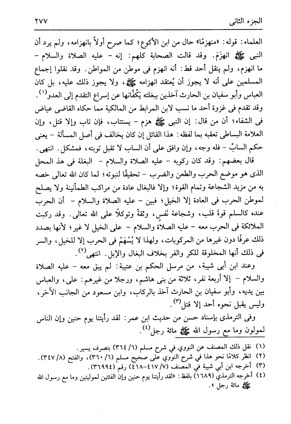 وَلَا يجوز ذَلِك عَلَيْهِ بل كَانَ الْعَبَّاس وَأَبُو سُفْيَان بن الْحَارِث آخذين ببغلته يَكُفَّانها عَن إسراع التَّقَدُّم إِلَى الْعَدو وَقد تقدم فِي غَزْوَة أحد مَا نسب لِابْنِ المرابط من الْمَالِكِيَّة مِمَّا حَكَاهُ القَاضِي عِيَاض فِي الشِّفَاء أَن من قَالَ إِن النَّبِي