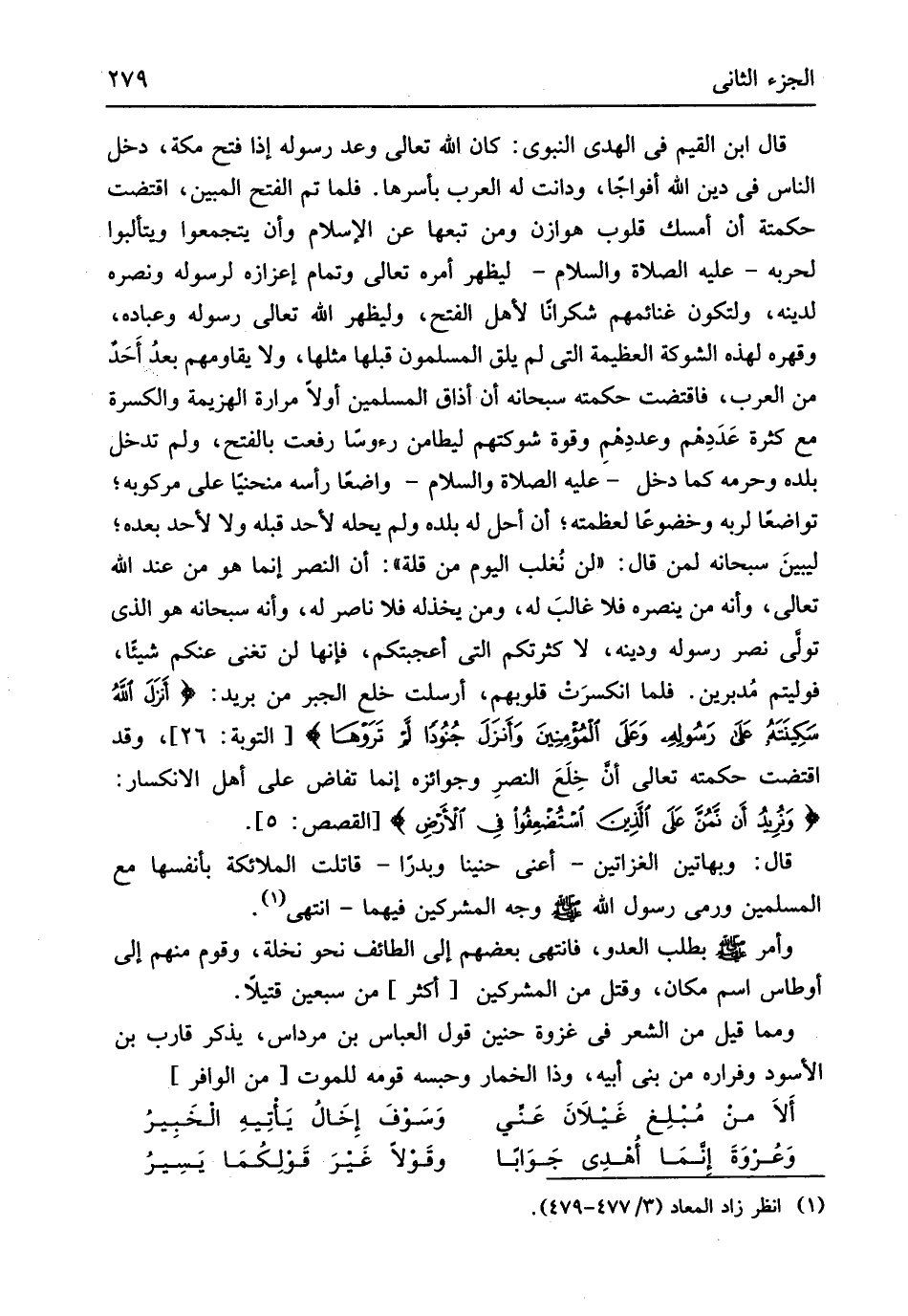 قَالَ ابْن الْقيم فِي الْهَدْي النَّبَوِيّ كَانَ الله تَعَالَى وعد رَسُوله إِذا فتح مَكَّة دخل النَّاس فِي دين الله أَفْوَاجًا ودانت لَهُ الْعَرَب بأسرها فَلَمَّا تمّ الْفَتْح الْمُبين اقْتَضَت حكمته أَن أمسك قُلُوب هوَازن وَمن تبعها عَن الْإِسْلَام وَأَن يتجمعوا ويتألبوا لحربه عَلَيْهِ الصَّلَاة وَالسَّلَام ليظْهر أمره تَعَالَى وَتَمام إعزازه لرَسُوله وَنَصره لدينِهِ ولتكون غنائمهم شكراناً لأهل الْفَتْح وليظهر الله تَعَالَى رَسُوله وعباده وقهره لهَذِهِ الشَّوْكَة الْعَظِيمَة الَّتِي لم يلق الْمُسلمُونَ قبلهَا مثلهَا وَلَا يقاومهم بعدُ أحَد من الْعَرَب فاقتضت حكمته سُبْحَانَهُ أَن أذاق الْمُسلمُونَ أَولا مرَارَة الْهَزِيمَة والكسرة مَعَ كَثْرَة عَدَدِهْم وعددهم وَقُوَّة شوكتهم ليطامن رُءُوسًا رفعت بِالْفَتْح وَلم تدخل بَلَده وَحرمه كَمَا دخل عَلَيْهِ الصَّلَاة وَالسَّلَام وَاضِعا رَأسه منحنياً على مركوبه تواضعاً لرَبه وخضوعاً لعظمته أَن أحل لَهُ بَلَده وَلم يحله لأحد قبله وَلَا لأحد بعده ليبينَ سُبْحَانَهُ لمن قَالَ لن نُغلب الْيَوْم من قلَّة أَن النَّصْر إِنَّمَا هُوَ من عِنْد الله تَعَالَى وَأَنه من ينصره فَلَا غالبَ لَهُ وَمن يَخْذُلهُ فَلَا نَاصِر لَهُ وَأَنه سُبْحَانَهُ هُوَ الَّذِي تولى نصر رَسُوله وَدينه لَا كثرتكم الَّتِي أَعجبتكُم فَإِنَّهَا لن تغني عَنْكُم شَيْئا فوليتم مُدبرين فَلَمَّا انكسرَتْ قلوبهمِ أرْسلت خلِع الْجَبْر من بريد {أنزَلَ اللهُ سَكيِنتَه عَلىَ رَسُوله وعَلى الْمُؤمنِينَ وَأنزل جُنُودا لم تَرَوْهَا} وَقد اقْتَضَت حكمته تَعَالَى أَن خِلَعَ النصرِ وجوائزه إِنَّمَا تفاض على أهل الانكسار {وَنرُيد أَن نمُنَّ عَلَى الَذِينَ أستُضعِفُوا فيِ الأرضِ} قَالَ وبهاتين الغزاتين أَعنِي حنيناً وبدراً قَاتَلت الْمَلَائِكَة بأنفسها مَعَ الْمُسلمين وَرمى رَسُول الله