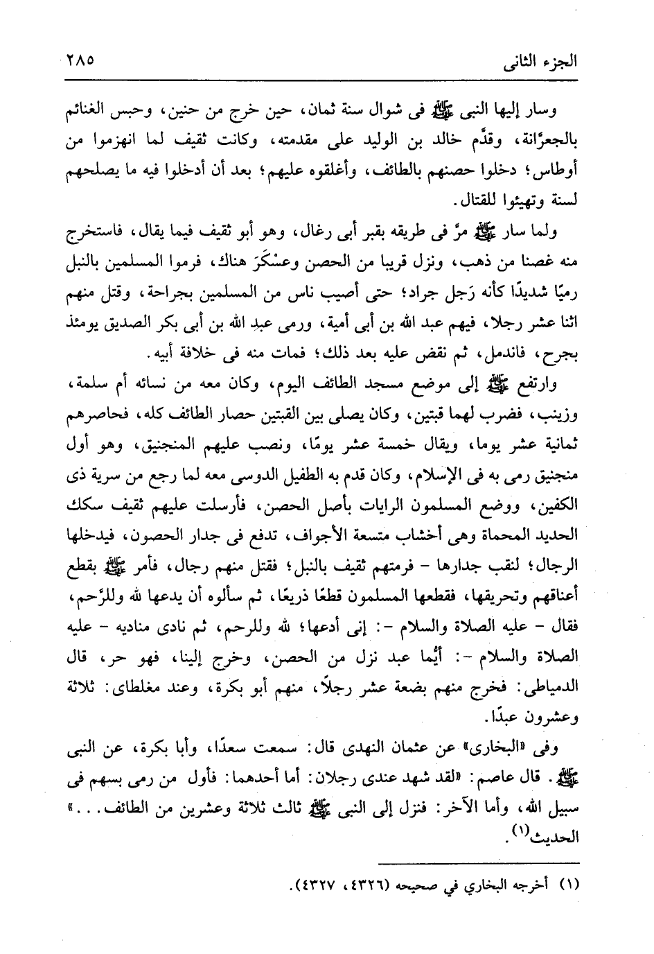 مرَ فِي طَرِيقه بِقَبْر أبي رِغَال وَهُوَ أَبُو ثَقِيف فِيمَا يُقَال فاستخرج مِنْهُ غصناً من ذهب وَنزل قَرِيبا من الْحصن وعسْكَرَ هُنَاكَ فرموا الْمُسلمين بِالنَّبلِ رمياً شَدِيدا كَأَنَّهُ رَجل جَراد حَتَّى أُصِيب نَاس من الْمُسلمين بجراحة وَقتل مِنْهُم اثْنَا عشر رجلا فيهم عبد الله بن أبي أُميَّة وَرمى عبد الله بن أبي بكر الصّديق يَوْمئِذٍ بِجرح فاندمل ثمَّ نقض عَلَيْهِ بعد ذَلِك فَمَاتَ مِنْهُ فِي خلَافَة أَبِيه وارتفع