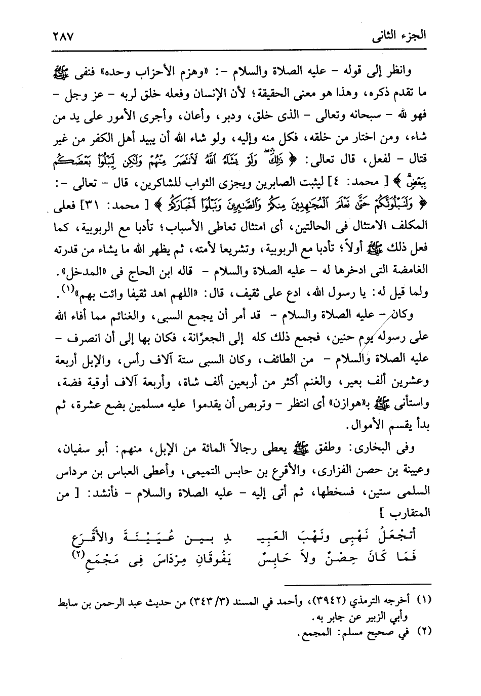 أَولا تأدباً مَعَ الربوبية وتشريعاً لأمته ثمَّ يظْهر الله مَا يَشَاء من قدرته الغامضة الَّتِي ادخرها لَهُ عَلَيْهِ الصَّلَاة وَالسَّلَام قَالَه ابْن الْحَاج فِي الْمدْخل وَلما قيل لَهُ يَا رَسُول الله ادْع على ثَقِيف قَالَ اللَّهُمَّ اهد ثقيفاً وائت بهم وَكَانَ عَلَيْهِ الصَّلَاة وَالسَّلَام قد أَمر أَن يجمع السَّبي والغنائم مِمَّا أَفَاء الله على رَسُوله يَوْم حنين فَجمع ذَلِك كُله إِلَى الجعرَانة فَكَانَ بهَا إِلَى أَن انْصَرف عَلَيْهِ الصَّلَاة وَالسَّلَام من الطَّائِف وَكَانَ السَّبي سِتَّة آلَاف رَأس وَالْإِبِل أَرْبَعَة وَعشْرين ألف بعير وَالْغنم أَكثر من أَرْبَعِينَ ألف شَاة وَأَرْبَعَة آلَاف أُوقِيَّة فضَّة واستأنى