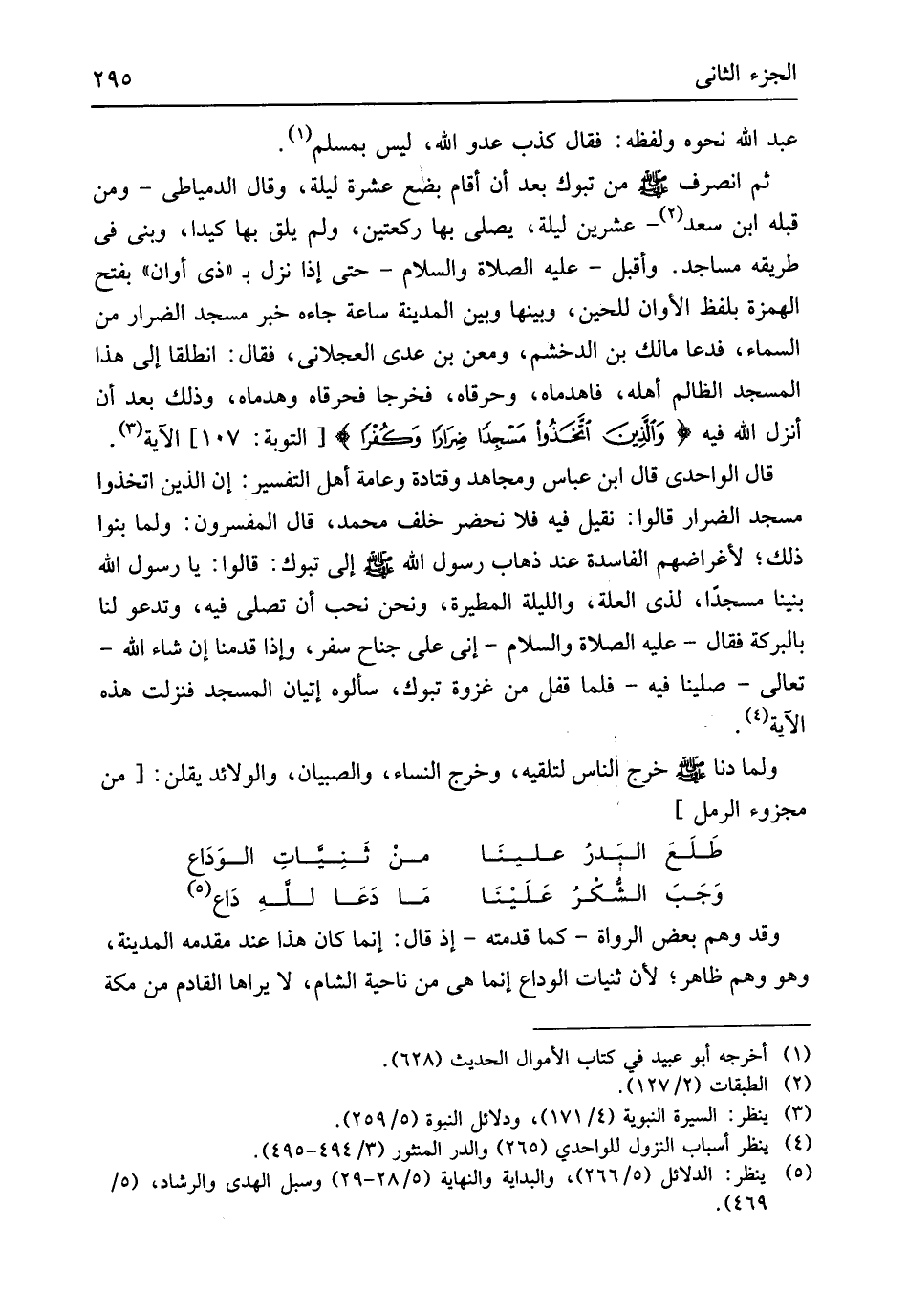 من تَبُوك بعد أَن أَقَامَ بضع عشرَة لَيْلَة وَقَالَ الدمياطي وَمن قبله ابْن سعد عشْرين لَيْلَة يُصَلِّي بهَا رَكْعَتَيْنِ وَلم يلق بهَا كيداً وَبنى فِي طَرِيقه مَسَاجِد وَأَقْبل عَلَيْهِ الصَّلَاة وَالسَّلَام حَتَّى إِذا نزل بِذِي أَوَان بِفَتْح الْهمزَة بِلَفْظ الأوان للحين وَبَينهَا وَبَين الْمَدِينَة سَاعَة جَاءَهُ خبر مَسْجِد الضرار من السَّمَاء فَدَعَا مَالك بن الدخشم ومعن بن عدي الْعجْلَاني فَقَالَ انْطَلقَا إِلَى هَذَا الْمَسْجِد الظَّالِم أَهله فَاهْدِمَاهُ وَحَرِّقَاهُ فَخَرَجَا فَحَرقَاهُ وَهَدَمَاهُ وَذَلِكَ بعد أَن أنزل الله فِيهِ {وَالَّذين اتَّخذُوا مَسْجِدا ضِرَارًا وَكفرا} الْآيَة قَالَ الواحدي قَالَ ابْن عَبَّاس وَمُجاهد وَقَتَادَة وَعَامة أهل التَّفْسِير إِن الَّذين اتَّخذُوا مَسْجِد الضرار قَالُوا نقِيل فِيهِ فَلَا نحضر خلف مُحَمَّد قَالَ الْمُفَسِّرُونَ وَلما بنوا ذَلِك لأغراضهم الْفَاسِدَة عِنْد ذهَاب رَسُول الله
