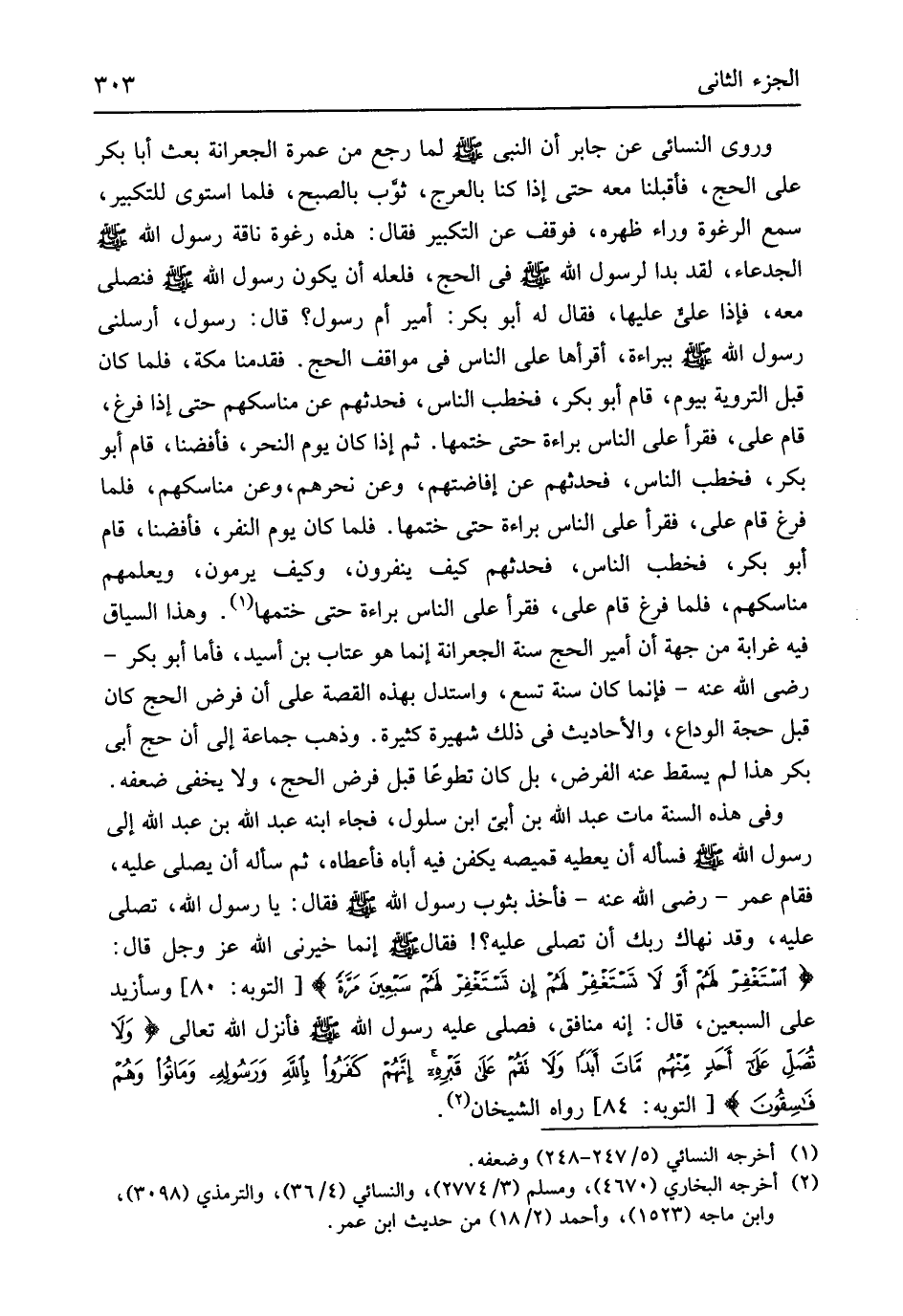 بِبَرَاءَة أقرأها على النَّاس فِي مَوَاقِف الْحَج فقدمنا مَكَّة فَلَمَّا كَانَ قبل التَّرويَة بِيَوْم قَامَ أَبُو بكر فَخَطب النَّاس فَحَدثهُمْ عَن مناسكهم حَتَّى إِذا فرغ قَامَ عَليّ فَقَرَأَ على النَّاس بَرَاءَة حَتَّى خَتمهَا ثمَّ إِذا كَانَ يَوْم النَّحْر فأفضنا قَامَ أَبُو بكر فَخَطب النَّاس فَحَدثهُمْ عَن إفاضتهم وَعَن نحرهم وَعَن مناسكهم فَلَمَّا فرغ قَامَ عَليّ فقرأعلى النَّاس بَرَاءَة حَتَّى خَتمهَا فَلَمَّا كَانَ يَوْم النَّفر فأفضنا قَامَ أَبُو بكر فَخَطب النَّاس فَحَدثهُمْ كَيفَ ينفرون وَكَيف يرْمونَ وَيُعلمهُم مناسكهم فَلَمَّا فرغ قَامَ عَليّ فَقَرَأَ على النَّاس بَرَاءَة حَتَّى خَتمهَا وَهَذَا السِّيَاق فِيهِ غرابة من جِهَة أَن أَمِير الْحَج سنة الْجِعِرَّانَة إِنَّمَا هُوَ عتاب بن أسيد فَأَما أَبُو بكر رَضِي الله عَنهُ فَإِنَّمَا كَانَ سنة تسع وَاسْتدلَّ بِهَذِهِ الْقِصَّة على أَن فرض الْحَج كَانَ قبل حجَّة الْوَدَاع وَالْأَحَادِيث فِي ذَلِك شهيرة كَثِيرَة وَذهب جمَاعَة إِلَى أَن حج أبي بكر هَذَا لم يسْقط عَنهُ الْفَرْض بل كَانَ تَطَوّعا قبل فرض الْحَج وَلَا يخفي ضعفه وَفِي هَذِه السّنة مَاتَ عبد الله بن أبي ابْن مسلول فجَاء ابْنه عبد الله بن عبد الله إِلَى رَسُول الله