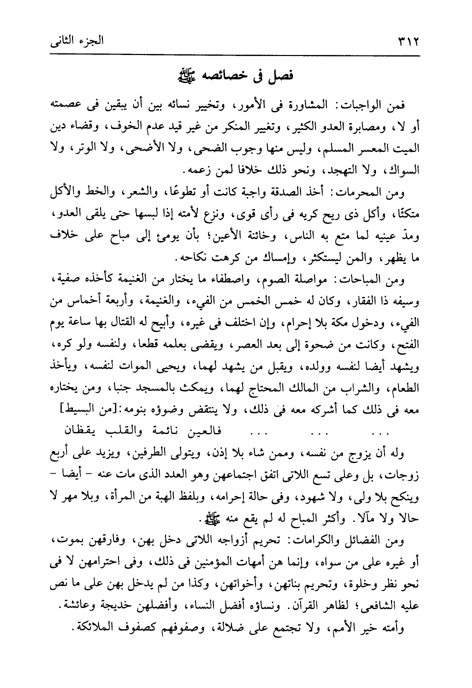 فَمن الْوَاجِبَات الْمُشَاورَة فِي الْأُمُور وتخيير نِسَائِهِ بَين أَن يبْقين فِي عصمته أَو لَا ومصابرة الْعَدو الْكثير وتغيير الْمُنكر من غير قيد عدم الْخَوْف وَقَضَاء دين الْمَيِّت الْمُعسر الْمُسلم وَلَيْسَ مِنْهَا وجوب الضُّحَى وَلَا الْأَضْحَى وَلَا الْوتر وَلَا السِّوَاك وَلَا التَّهَجُّد وَنَحْو ذَلِك خلافًا لمن زَعمه وَمن الْمُحرمَات أَخذ الصَّدَقَة وَاجِبَة كَانَت أَو تَطَوّعا وَالشعر والخط وَالْأكل مُتكئا وَأكل ذِي ريح كريه فِي رَأْي قوي وَنزع لأمته إِذا لبسهَا حَتَّى يلقى الْعَدو ومدّ عَيْنَيْهِ لما متع بِهِ النَّاس وخائنة الْأَعْين بِأَن يومىء إِلَى مُبَاح على خلاف مَا يظْهر والمن ليستكثر وإمساك من كرهت نِكَاحه وَمن الْمُبَاحَات مُوَاصلَة الصَّوْم واصطفاء مَا يخْتَار من الْغَنِيمَة كأخذه صَفِيَّة وسيفه ذَا الفقار وَكَانَ لَهُ خمس الْخمس من الْفَيْء وَالْغنيمَة وَأَرْبَعَة أَخْمَاس من الْفَيْء وَدخُول مَكَّة بِلَا إِحْرَام وَإِن اخْتلف فِي غَيره وأبيح لَهُ الْقِتَال بهَا سَاعَة يَوْم الْفَتْح وَكَانَت من ضحوة إِلَى بعد الْعَصْر وَيَقْضِي بِعِلْمِهِ قطعا ولنفسه وَلَو كره وَيشْهد أَيْضا لنَفسِهِ وَولده وَيقبل من يشْهد لَهما وَيحيى الْموَات لنَفسِهِ وَيَأْخُذ الطَّعَام وَالشرَاب من الْمَالِك الْمُحْتَاج لَهما وَيمْكث بِالْمَسْجِدِ جنبا وَمن يختاره مَعَه فِي ذَلِك كَمَا أشركه مَعَه فِي ذَلِك وَلَا ينْتَقض وضوؤه بنومه // (من الْبَسِيط) //
