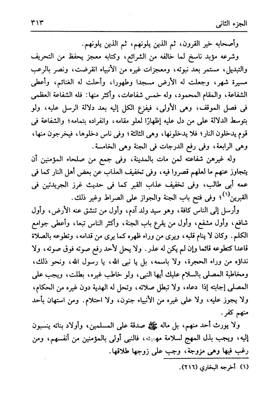 وَأَصْحَابه خير الْقُرُون ثمَّ الَّذين يَلُونَهُمْ ثمَّ الَّذين يَلُونَهُمْ وشرعه مؤبد نَاسخ لما خَالفه من الشَّرَائِع وَكتابه معجز يحفظ من التحريف والتبديل مُسْتَمر بعد نبوته ومعجزات غَيره من الْأَنْبِيَاء انقرضت وَنصر بِالرُّعْبِ مسيرَة شهر وَجعلت لَهُ الأَرْض مَسْجِدا وَطهُورًا وَأحلت لَهُ الْغَنَائِم وَأعْطِي الشَّفَاعَة وَالْمقَام الْمَحْمُود وَله خمس شفاعات وَأكْثر مِنْهَا فَلهُ الشَّفَاعَة الْعُظْمَى فِي فصل الْموقف وَهِي الأولى فَيفزع الْكل إِلَيْهِ بعد دلَالَة الرُّسُل عَلَيْهِ وَلَو بتوسط الدّلَالَة على من دلّ عَلَيْهِ إِظْهَارًا لعلو مقَامه وانفراده بِتَمَامِهِ والشفاعة فِي قوم يدْخلُونَ النَّار فَلَا يدْخلُونَهَا وَهِي الثَّالِثَة وَفِي نَاس دخلوها فَيخْرجُونَ مِنْهَا وَهِي الرَّابِعَة وَفِي رفع الدَّرَجَات فِي الْجنَّة وَهِي الْخَامِسَة وَله غَيْرهنَّ شَفَاعَته لمن مَاتَ بِالْمَدِينَةِ وَفِي جمع من صلحاء الْمُؤمنِينَ أَن يتَجَاوَز عَنْهُم مَا لَعَلَّهُم قصروا فِيهِ وَفِي تَخْفيف الْعَذَاب عَن بعض هَل النَّار كَمَا فِي عَمه أبي طَالب وَفِي تَخْفيف عَذَاب الْقَبْر كَمَا فِي حَدِيث غرز الجريدتين فِي القبرين وَفِي فتح بَاب الْجنَّة وَالْجَوَاز على الصِّرَاط وَغير ذَلِك وَأرْسل إِلَى النَّاس كَافَّة وَهُوَ سيد ولد آدم وَأول من تَنْشَق عَنهُ الأَرْض وَأول شَافِع وَأول مُشَفع وَأول من يقرع بَاب الْجنَّة وَأكْثر النَّاس تبعا وَأعْطِي جَوَامِع الْكَلم وَكَانَ لَا ينَام قلبه وَيرى من وَرَاء ظَهره كَمَا يرى من قدامه وتطوعه بِالصَّلَاةِ قَاعِدا كتطوعه قَائِما وَإِن لم يكن لَهُ عذر وَلَا يحل لأحد رفع صَوته فَوق صَوته وَلَا نداؤه من وَرَاء الْحُجْرَة وَلَا باسمه بل يَا نَبِي الله يَا رَسُول الله وَنَحْو ذَلِك ومخاطبة الْمُصَلِّي بِالسَّلَامِ عَلَيْك أَيهَا النَّبِي وَلَو خَاطب غَيره بطلت وَيجب على الْمُصَلِّي إجَابَته إِذا دَعَاهُ وَلَا تبطل صلَاته وَتحل لَهُ الْهَدِيَّة دون غَيره من الْحُكَّام وَلَا يجوز عَلَيْهِ وَلَا على غَيره من الْأَنْبِيَاء جُنُون وَلَا احْتِلَام وَمن استهان بِأحد مِنْهُم كفر وَلَا يُورث أحد مِنْهُم بل مَاله