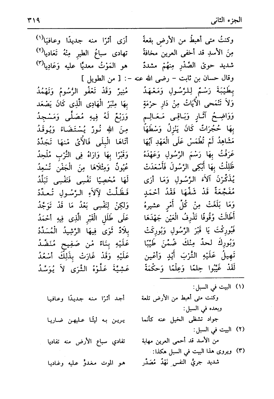 (بِطَيْبَةَ رَسْمٌ لِلَّرَسُولِ وَمَعْهَدُ ... مُنِيرٌ وَقَدْ تَعْفُو الرُّسُومُ وَتَهْمُدُ)