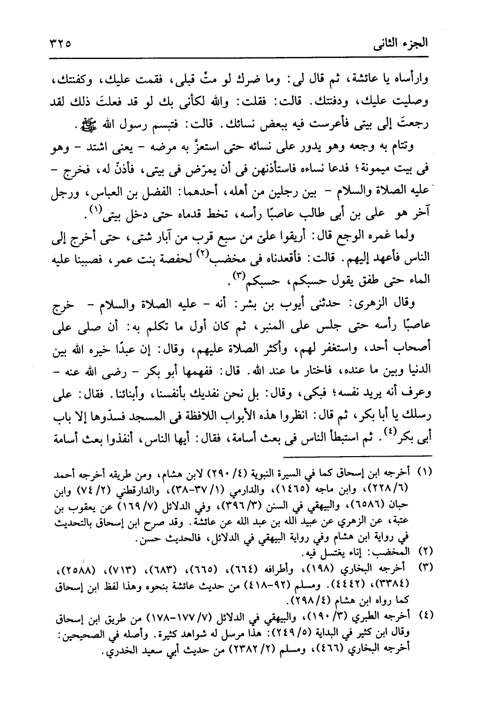 وتتام بِهِ وَجَعه وَهُوَ يَدُور على نِسَائِهِ حَتَّى استعزَّ بِهِ مَرضه يَعْنِي اشْتَدَّ وَهُوَ فِي بَيت مَيْمُونَة فَدَعَا نِسَاءَهُ فاستأذنهن فِي أَن يمرض فِي بَيْتِي فَأذن لَهُ فَخرج عَلَيْهِ الصَّلَاة وَالسَّلَام بَين رجلَيْنِ من أَهله أَحدهمَا الْفضل بن الْعَبَّاس وَرجل آخر هُوَ عَليّ بن أبي طَالب عاصباً رَأسه تخط قدماه حَتَّى دخل بَيْتِي وَلما غمره الوجع قَالَ أريقوا عليّ من سبع قرب من آبار شَتَّى حَتَّى أخرج إِلَى النَّاس فأعهد إِلَيْهِم قَالَت فأقعدناه فِي مخضب لحفصة بنت عمر فصببنا عَلَيْهِ المَاء حَتَّى طفق يَقُول حسبكم حسبكم وَقَالَ الزُّهْرِيّ حَدثنِي أَيُّوب بن بشر أَنه عَلَيْهِ الصَّلَاة وَالسَّلَام خرج عاصباً رَأسه حَتَّى جلس على الْمِنْبَر ثمَّ كَانَ أول مَا تكلم بِهِ أَن صلى على أَصْحَاب أحد واستغفر لَهُم وَأكْثر الصَّلَاة عَلَيْهِم وَقَالَ إِن عبدا خَيره الله بَين الدُّنْيَا وَبَين مَا عِنْده فَاخْتَارَ مَا عِنْد الله قَالَ ففهمها أَبُو بكر رَضِي الله عَنهُ وَعرف أَنه يُرِيد نَفسه فَبكى وَقَالَ بل نَحن نفديك بِأَنْفُسِنَا وأبنائنا فَقَالَ على رسلك يَا أَبَا بكر ثمَّ قَالَ انْظُرُوا هَذِه الْأَبْوَاب اللافظة فِي الْمَسْجِد فسدوها إِلَّا بَاب أبي بكر ثمَّ استبطأ النَّاس فِي بعث أُسَامَة فَقَالَ أَيهَا النَّاس أنفذوا بعث أُسَامَة