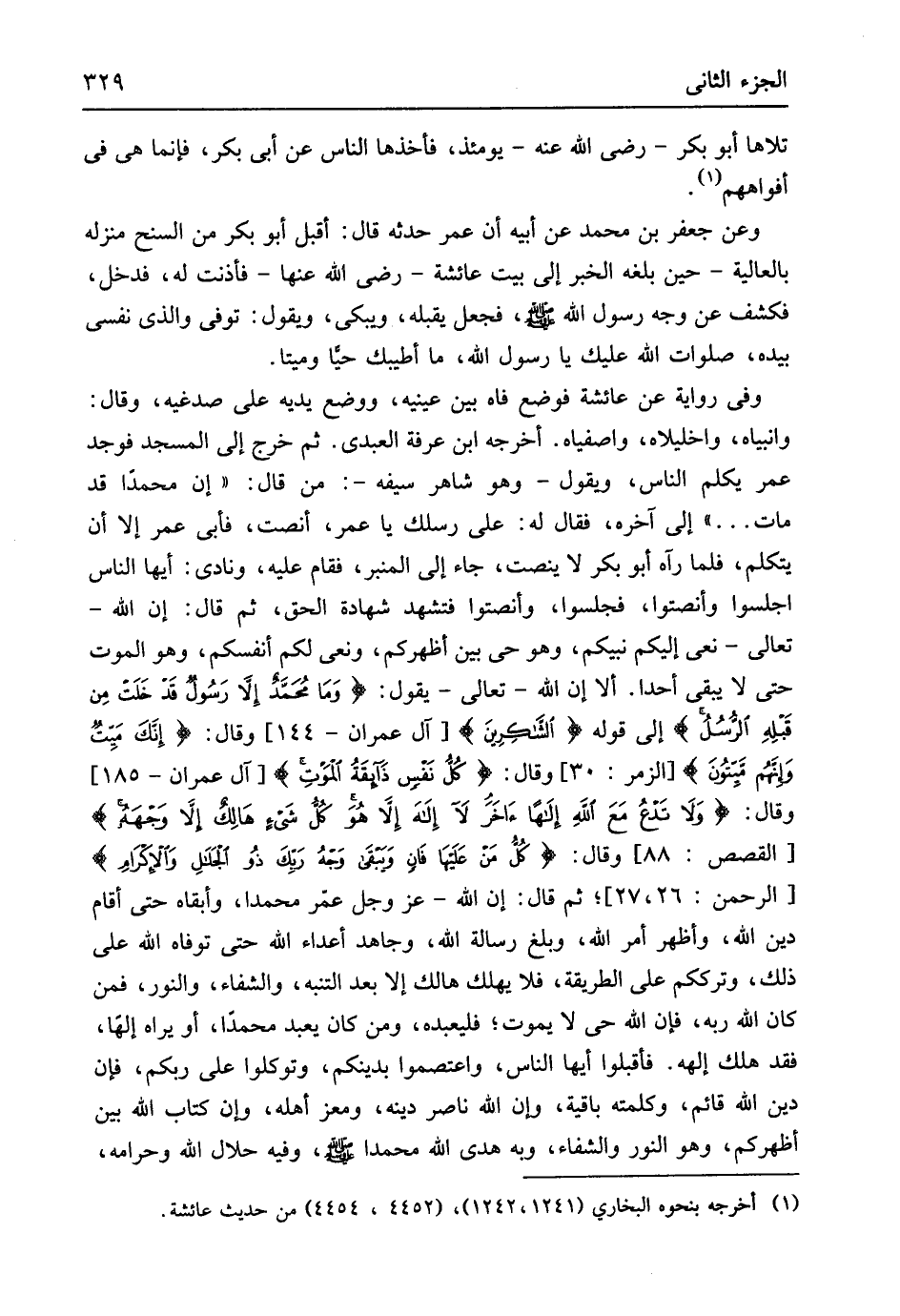 فَجعل يقبله ويبكي وَيَقُول توفّي والذى نَفسِي بِيَدِهِ صلوَات الله عَلَيْك يَا رَسُول اله مَا أطيبك حَيا وَمَيتًا وَفِي رِوَايَة عَن عَائِشَة فَوضع فَاه بَين عَيْنَيْهِ وَوضع يَدَيْهِ على صدغيه وَقَالَ وانبياه واخليلاه واصفياه أخرجه ابْن عَرَفَة الْعَبْدي ثمَّ خرج إِلَى الْمَسْجِد فَوجدَ عمر يكلم النَّاس وَيَقُول وَهُوَ شاهر سَيْفه من قَالَ إِن مُحَمَّدًا قد مَاتَ ... إِلَى آخِره فَقَالَ لَهُ على رسلك يَا عمر أنصت فَأبى عمر إِلَّا أَن يتَكَلَّم فَلَمَّا رَآهُ أَبُو بكر لَا ينصت جَاءَ إِلَى الْمِنْبَر فَقَامَ عَلَيْهِ ونادى أَيهَا النَّاس اجلسوا وأنصتوا فجلسوا وأنصتوا فَتشهد شَهَادَة الْحق ثمَّ قَالَ إِن الله تَعَالَى نعى إِلَيْكُم نَبِيكُم وَهُوَ حَيّ بَين أظْهركُم ونعى لكم أَنفسكُم وَهُوَ الْمَوْت حَتَّى لَا يبقي أحدا أَلا إِن الله تَعَالَى يَقُول {وَمَا مُحَمَّدٌ إِلَّا رَسُول قَد خلت مِن قبلِهِ الرسُل} إِلَى قَوْله {الشاكرِين} آل عمرَان 144 وَقَالَ {إِنك مَيتُ وَإِنَّهُم ميتُونَ} الزمر 30 وَقَالَ {كل نَفسٍ ذائقَةُ الْمَوْت} آل عمرَان 185 وَقَالَ {وَلَا تَدعُ مَعَ الله إِلهاً آخَرَ لَا إلَهَ إِلَّا هُو كل شَيءٍ هَالِك إِلَّا وَجهَهُ} الْقَصَص 88 وَقَالَ {كُلُ مَنْ عَلَيْهَا فَانِ وَيبقى وَجهُ رَبِك ذوُ الجَلاَلِ وَالإكرامِ} الرَّحْمَن 26، 27 ثمَّ قَالَ إِن الله عز وَجل عمّر مُحَمَّدًا وأبقاه حَتَّى أَقَامَ دين الله وَأظْهر أَمر الله وَبلغ رِسَالَة الله وجاهد أَعدَاء الله حَتَّى توفاه الله على ذَلِك وترككم على الطَّرِيقَة فَلَا يهْلك هَالك إِلَّا بعد التنبه والشفاء والنور فَمن كَانَ الله ربه فَإِن الله حَيّ لَا يَمُوت فليعبده وَمن كَانَ يعبد مُحَمَّدًا أَو يرَاهُ إلهَاً فقد هلك إلهه فَأَقْبَلُوا أَيهَا النَّاس واعتصموا بدينكم وتوكلوا على ربكُم فَإِن دين الله قَائِم وكلمته بَاقِيَة وَإِن الله نَاصِر دينه ومعز أَهله وَإِن كتاب الله بَين أظْهركُم وَهُوَ النُّور والشفاء وَبِه هدى الله مُحَمَّدًا